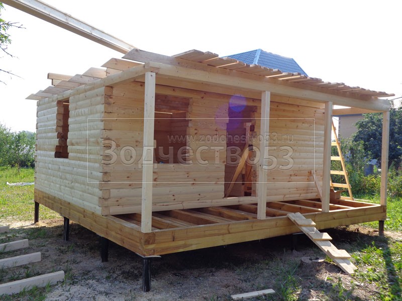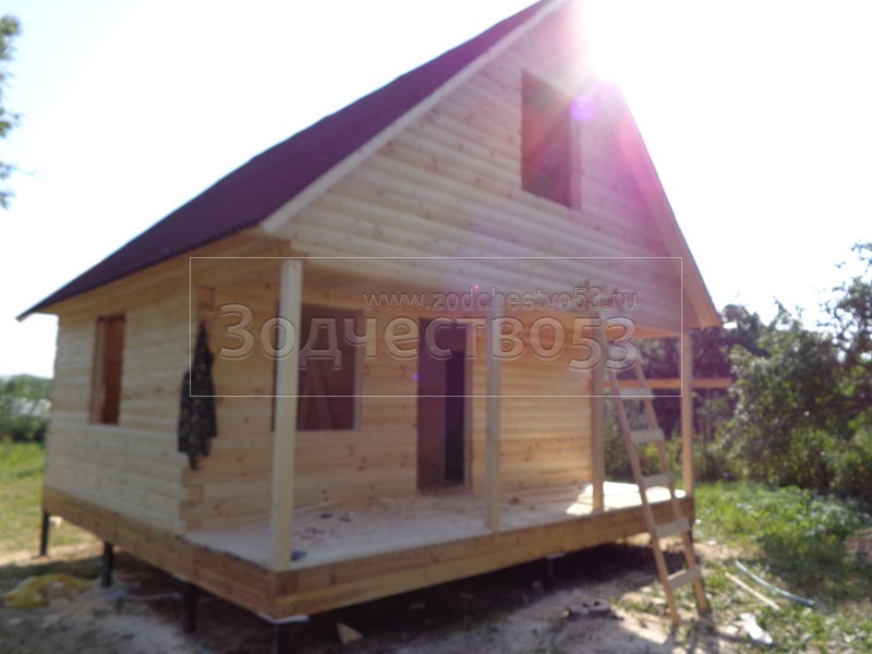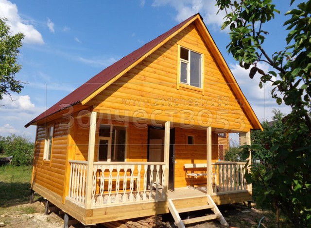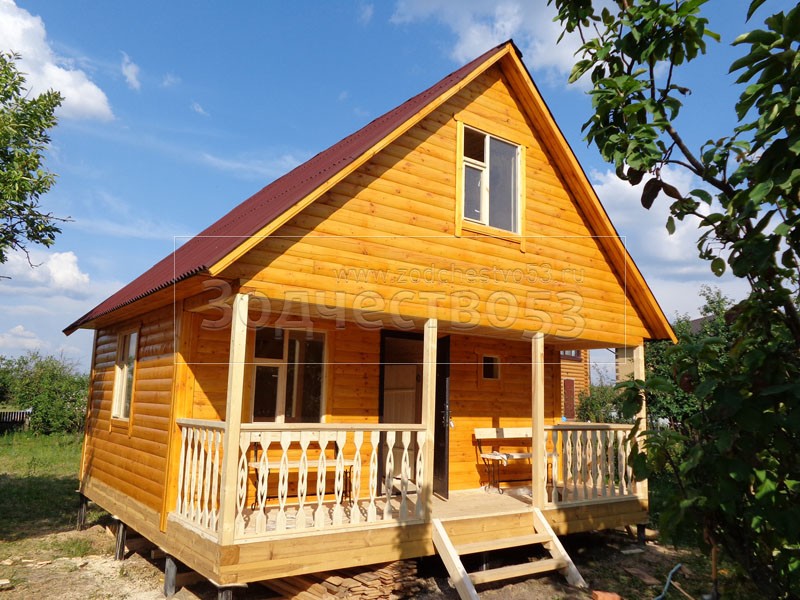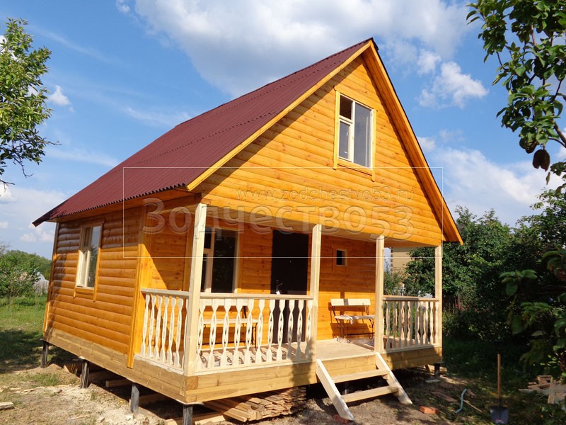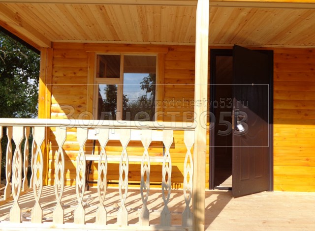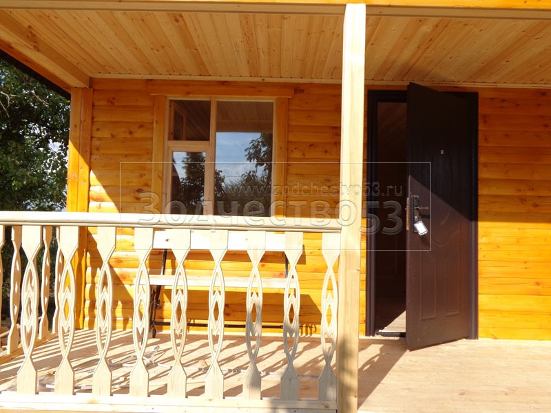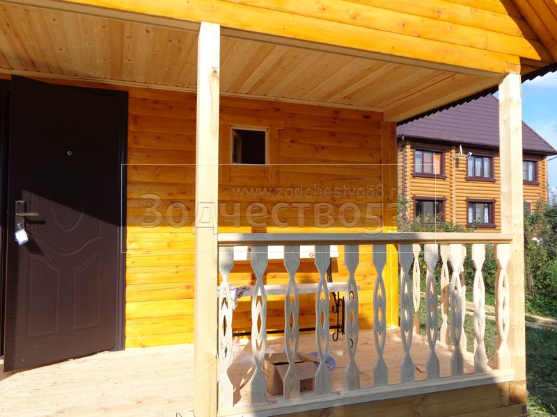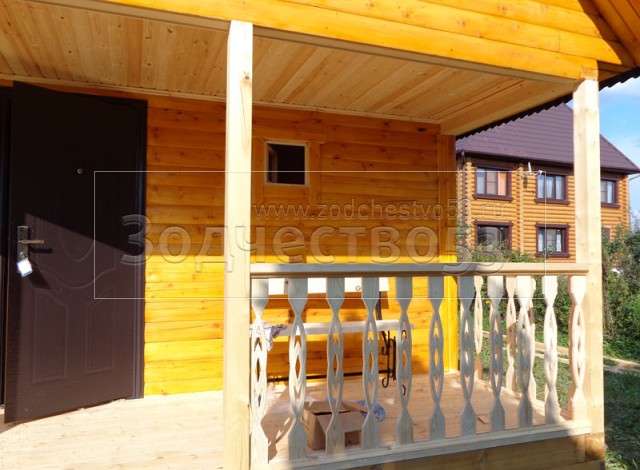 Баня 6×6 м. по проекту Примула из профилированного бруса 150×150 под двухскатной крышей (сруб бани 6×4.5 + открытая терраса с резными балясинами 4×1.5 под общей крышей). Построена в Калужской области, Жуковский район, д. Новоселки.