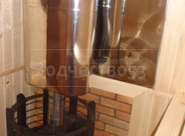 - В парной установлена печь Ермак 16 ПС (сетка) с сендвич-трубами через крышу и с обложкой из кирпича + бак на печь 60 литров.