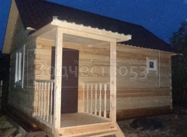 Одноэтажная баня 4×6 м. по проекту Дельфиниум из профилированного бруса 150×150 под двухскатной крышей и крыльцом 1.5×1.5 м. под отдельной крышей. Построена в Новгородской области, в селе Бронница
