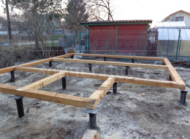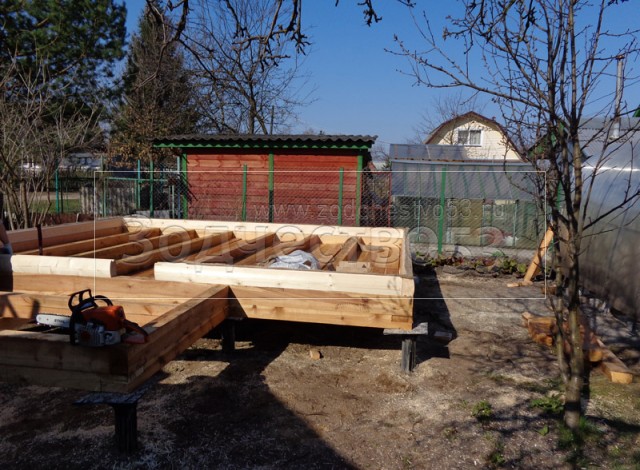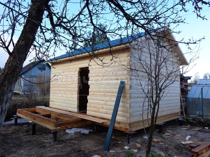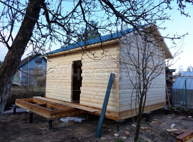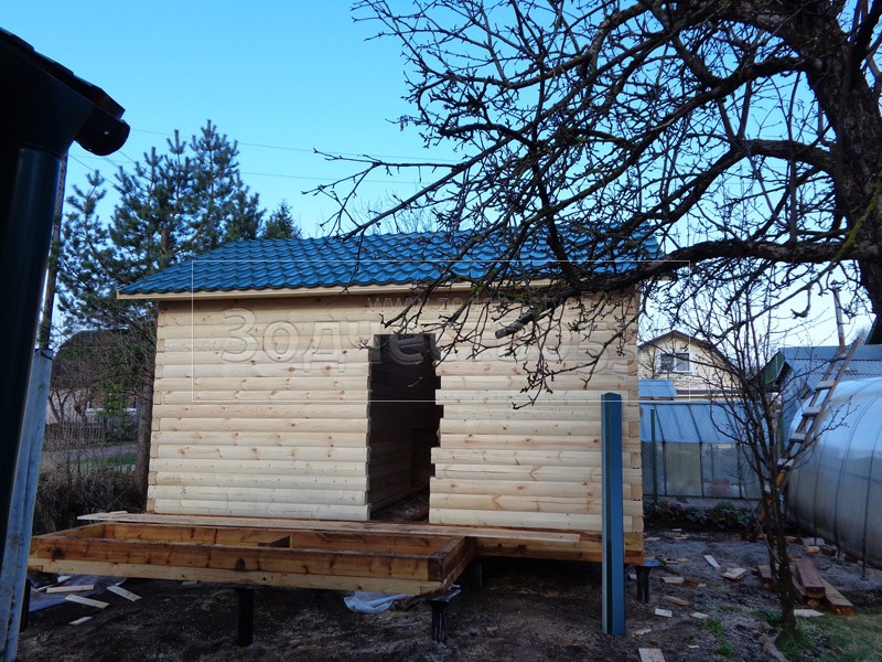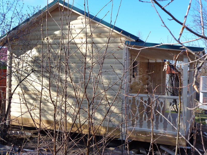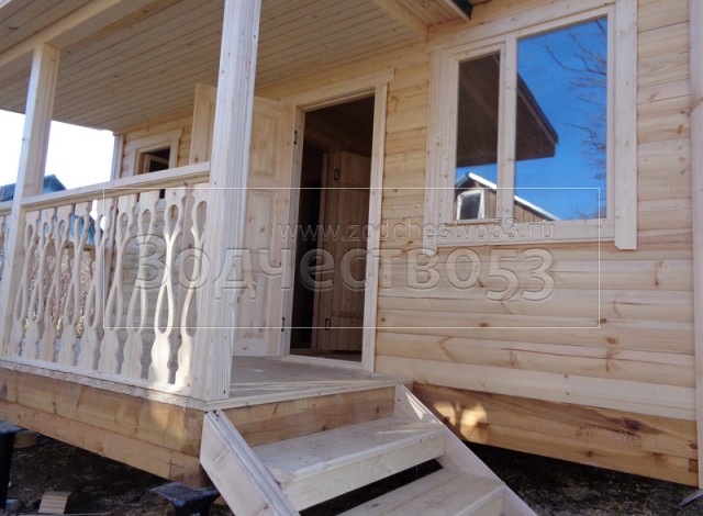 Баня построена по проекту "Лилия" с дополнением заказчика - открытая терасса с резными балясинами. С изменением размеров по длине: 5х4 баня (брус 100х150) и открытая терасса 1,5х3,5.