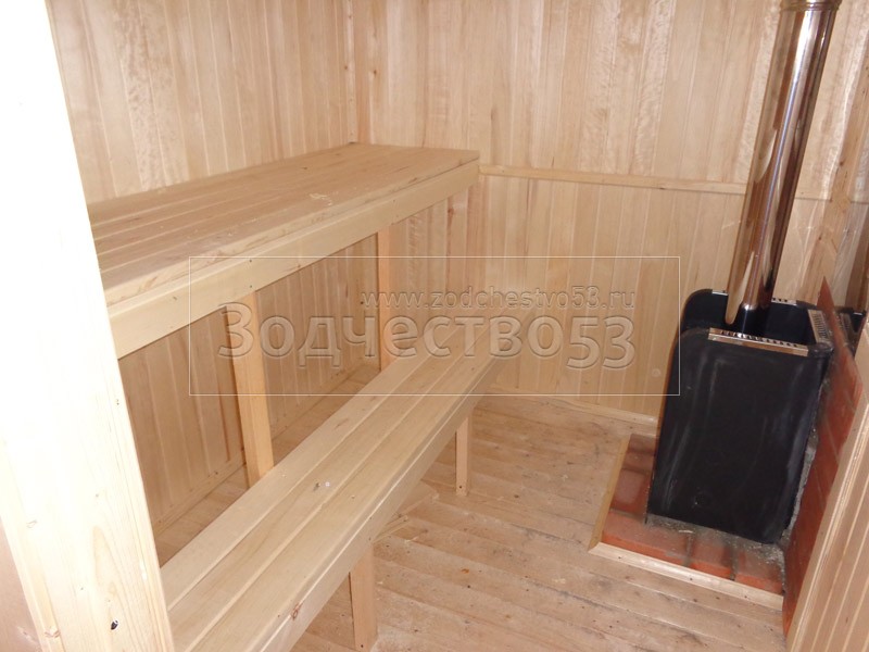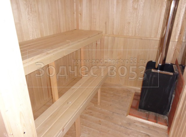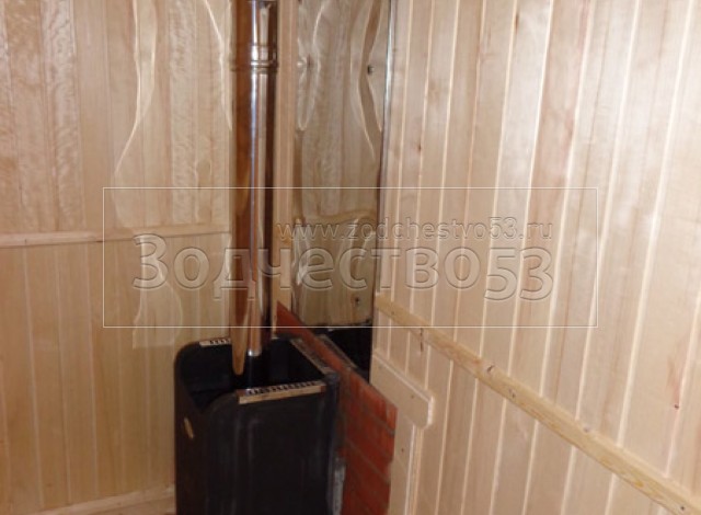 - Была установлена печь Ермак 12, + все комплектующие с сэндвич трубами через крышу. Печь обкладывалась кирпичём.