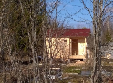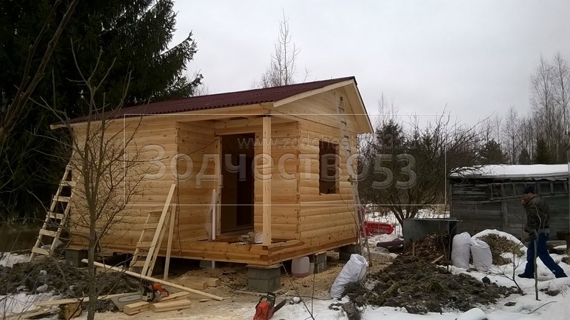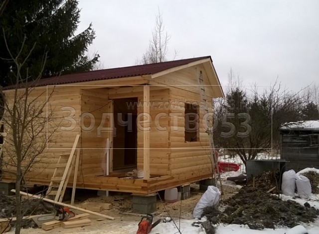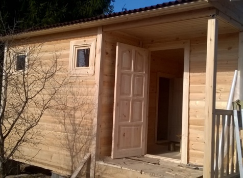 Одноэтажная баня размерами 5.0×4.0 из профилированного бруса 150×150 под двухскатной крышей со смещенным фронтоном. Построена: Ленинградская область, Тосненский район.