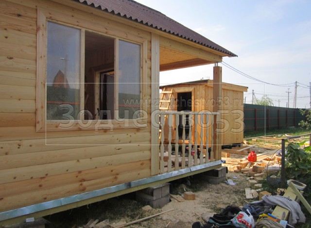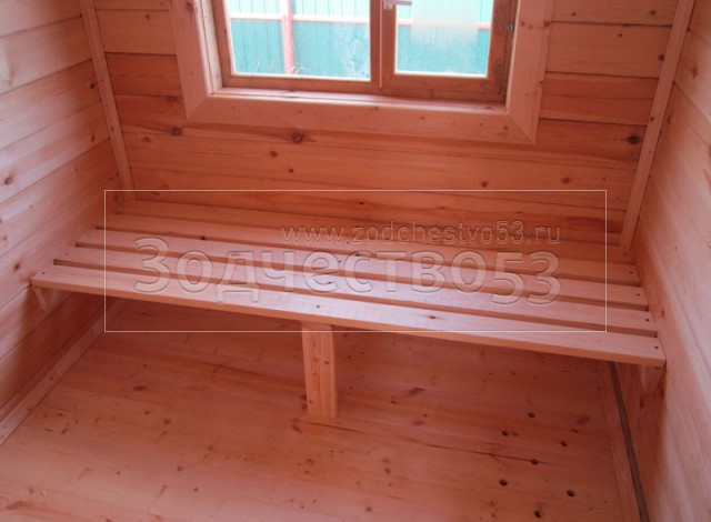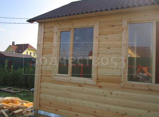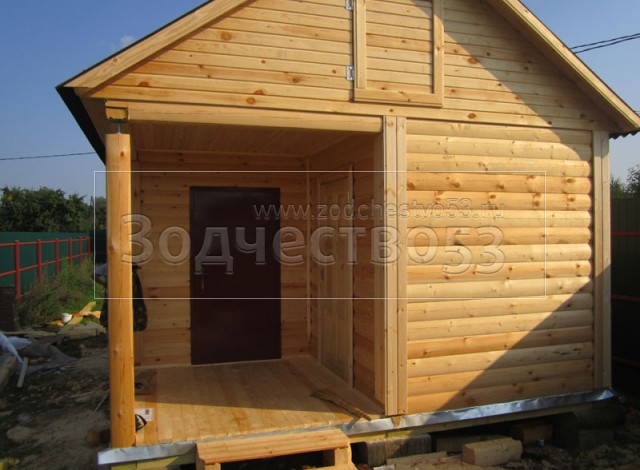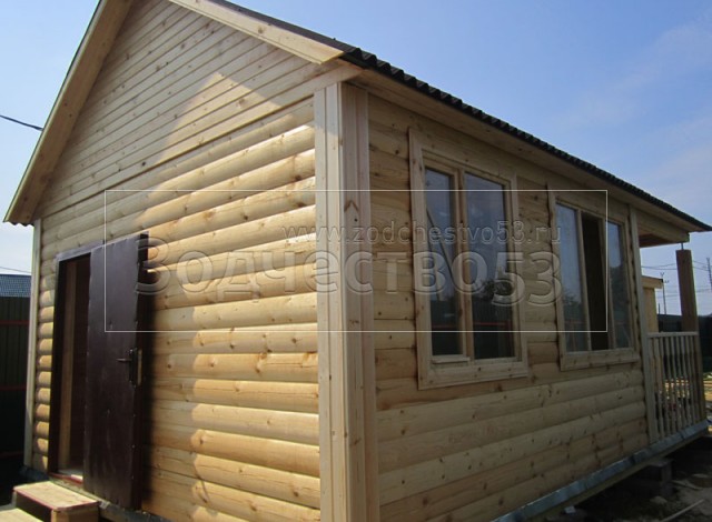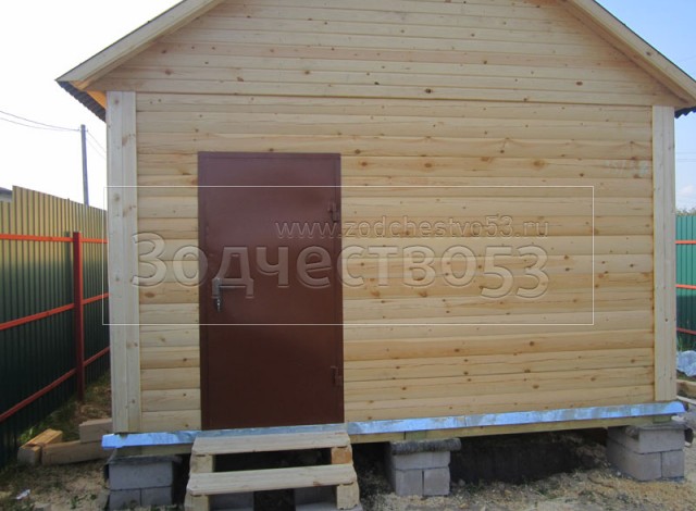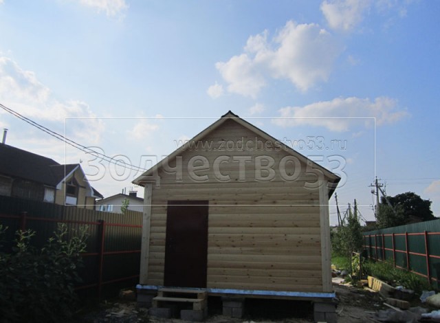 Баня из профилированного бруса 150×150 под двухскатной крышей по проекту Георгин. Построена в Московской области, Домодедовский район, д. Шестово.