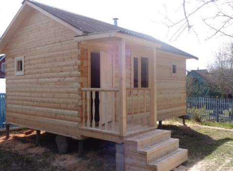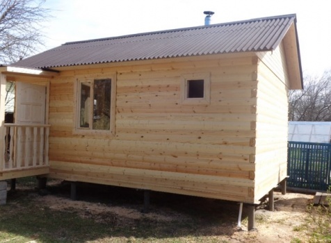 Одноэтажная баня 6.0×4.0 из профилированного бруса 100×150 под двухскатной крышей и крыльцо 1.5×1.0 под отдельной крышей. Построена: Тверская область, СНТ Колос-2