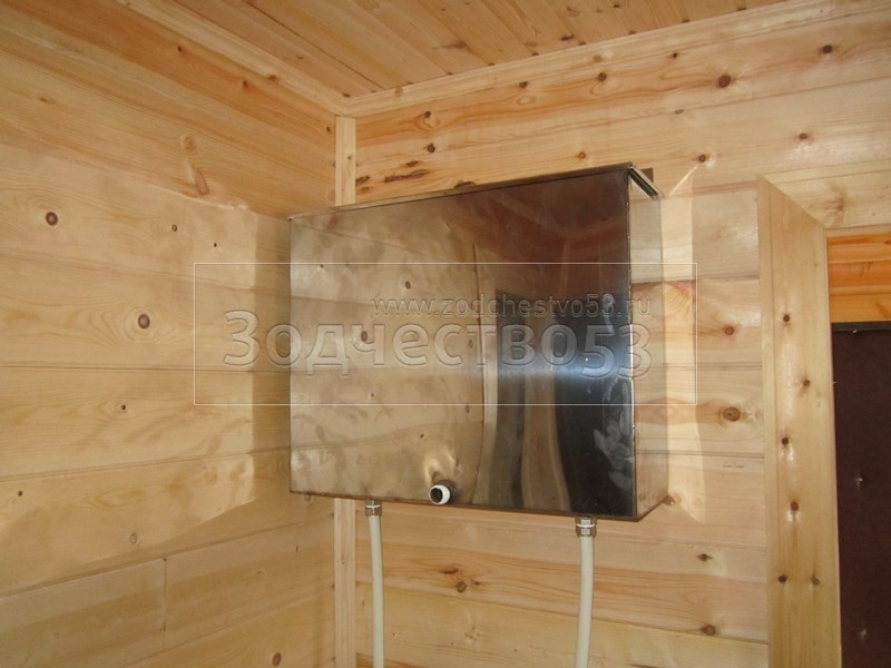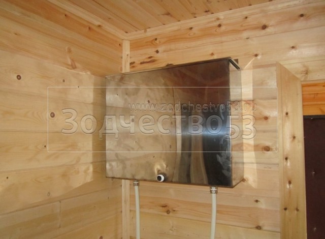 - Печь «Ермак 12 Элит со стеклом» + все комплектующие с сендвич трубами через крышу, с обложкой печи из кирпича + бак под воду на 55 литров.
