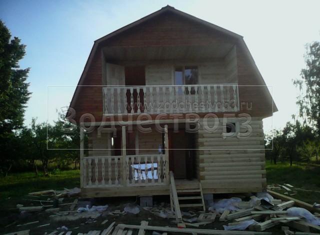 Баня 6×6 из профилированного бруса 150×150 по проекту Орхидея с ломаной крышей (6×4.5 — сруб бани, открытая терраса с резными балясинами 4×1.5 и балкон 4×1.5 открытый с резными балясинами). Построена в Тверской области, Торжокский район