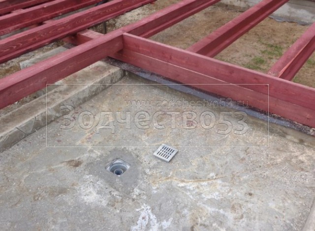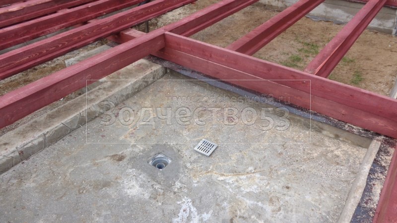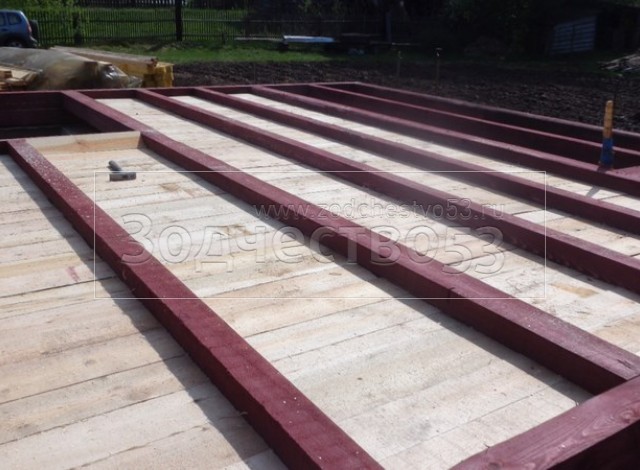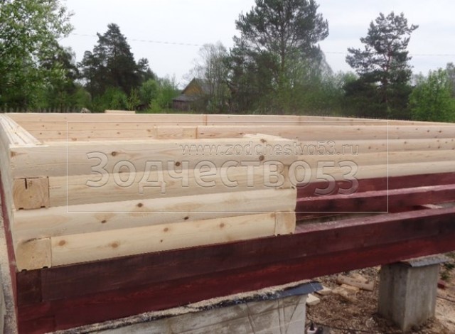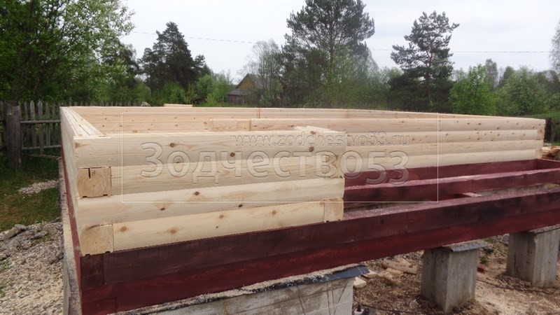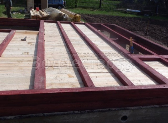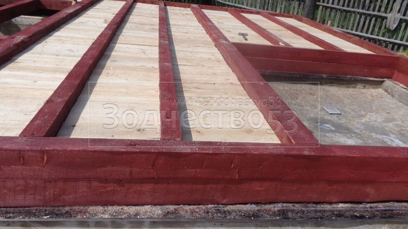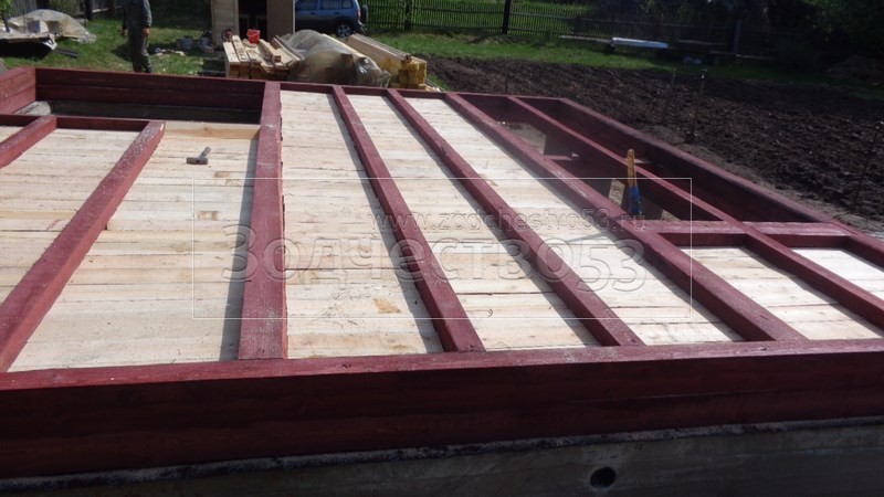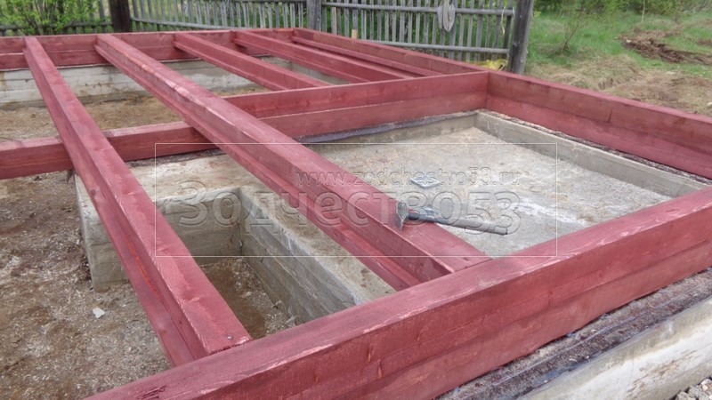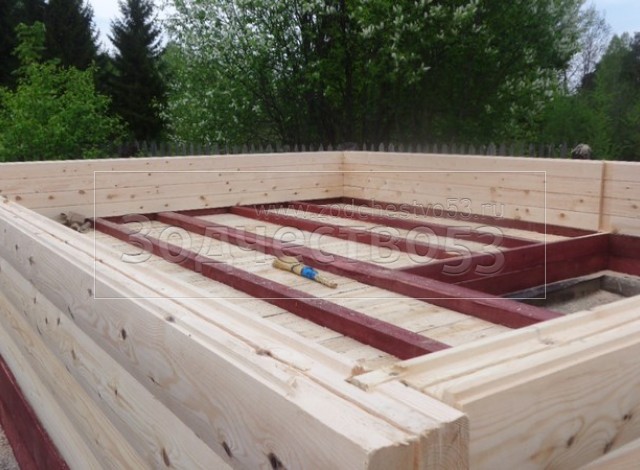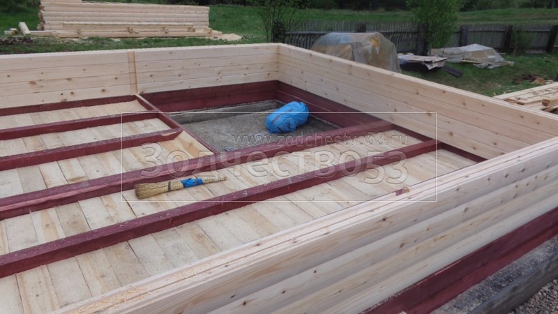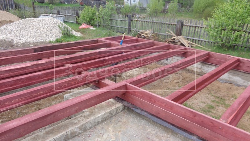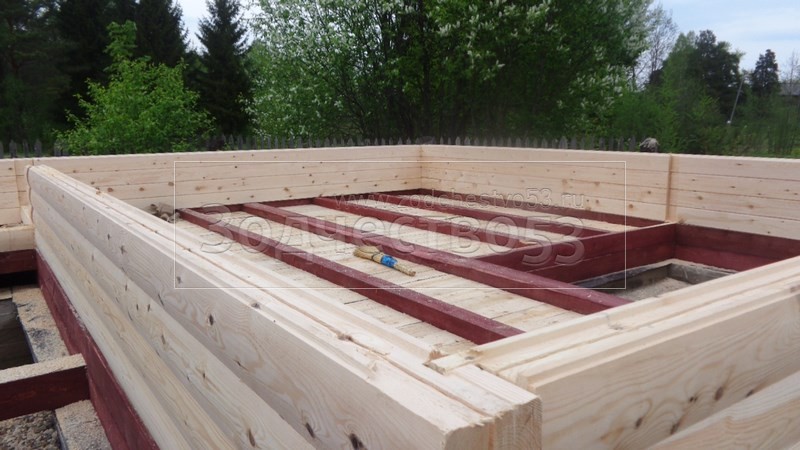 - Обвязка из бруса 150×150, лаги 100×150 через 90 см.