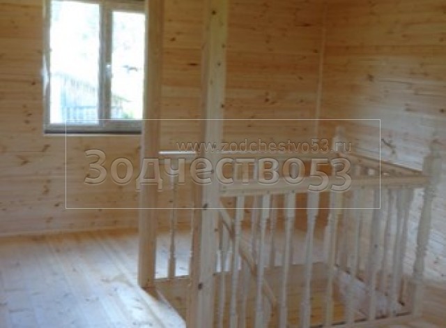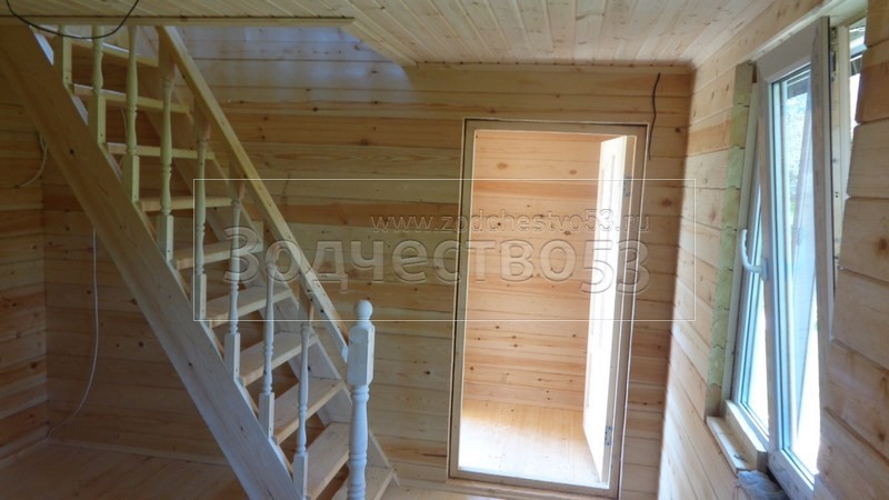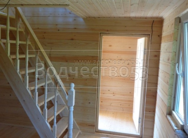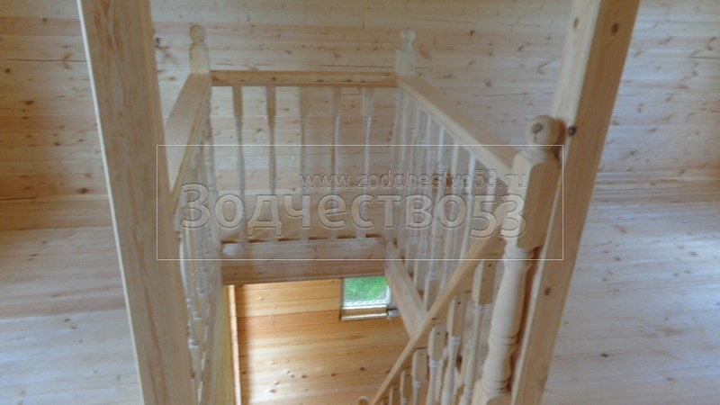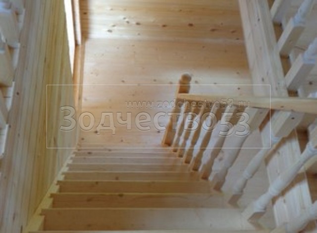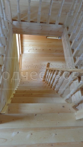 - Лестница одномаршевая с точёными балясинами, перилами и стартовыми столбами.