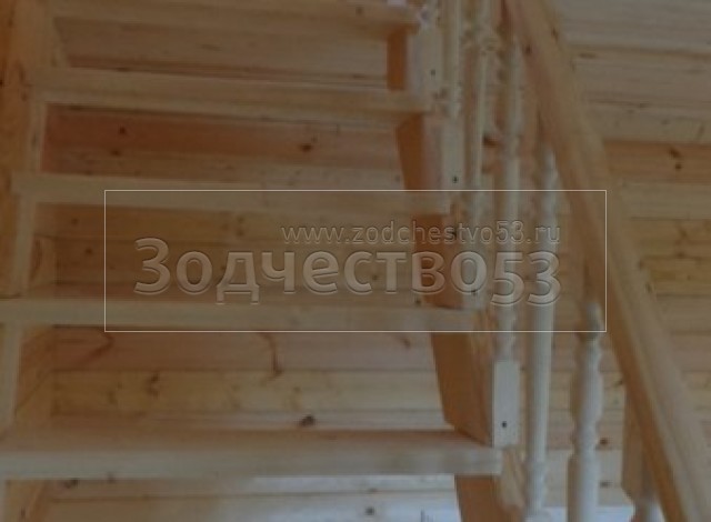 - Лестница одномаршевая с точёными балясинами, стартовыми столбами и перилами.
