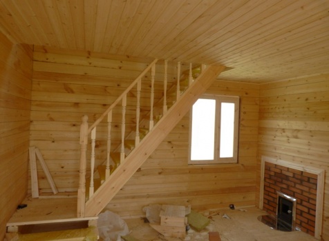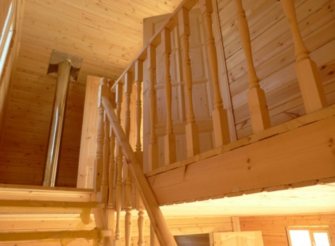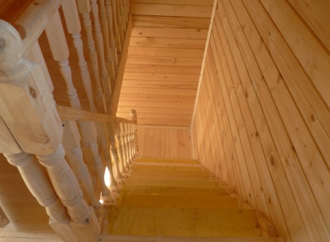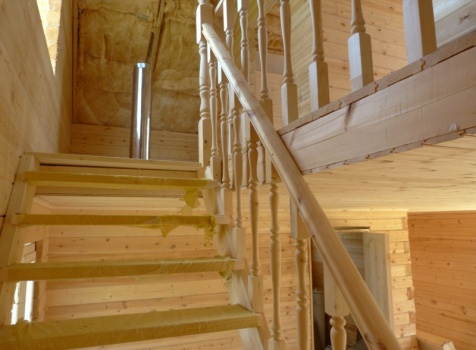 • Лестница двухмаршевая с точеными балясинами и перилами.