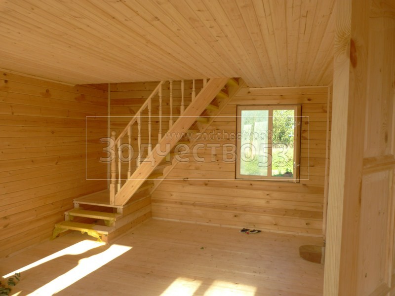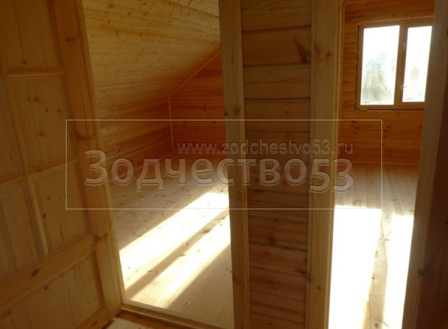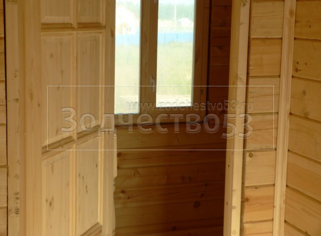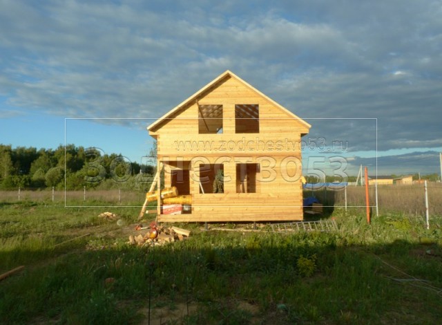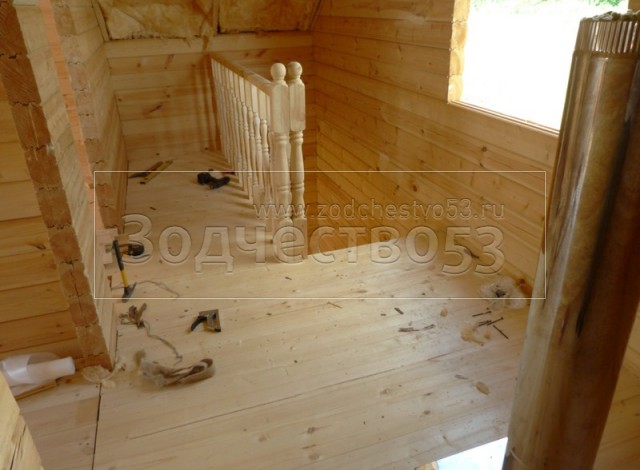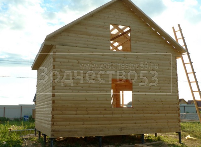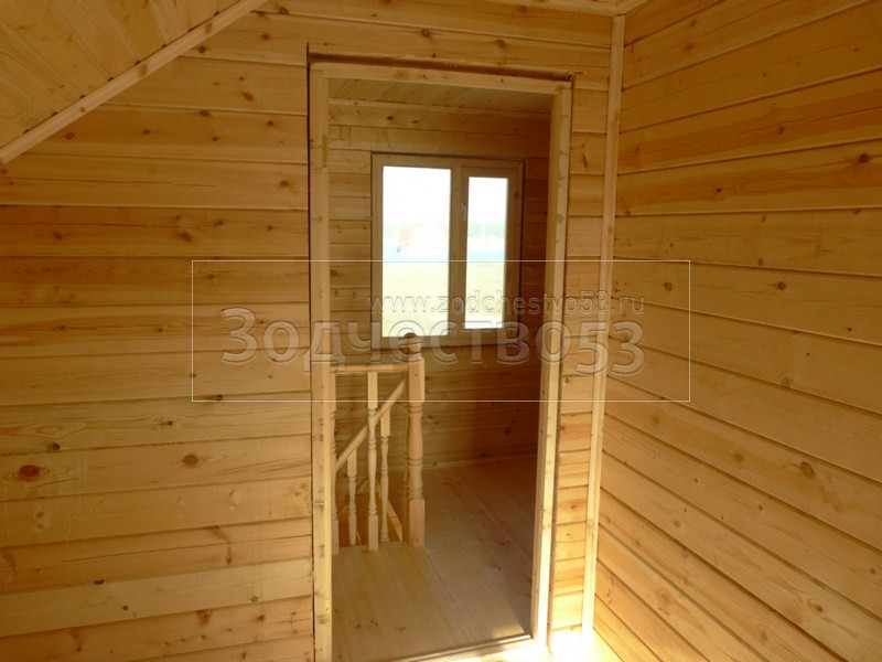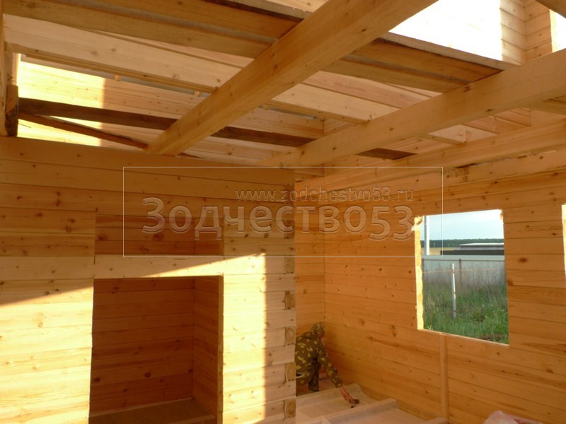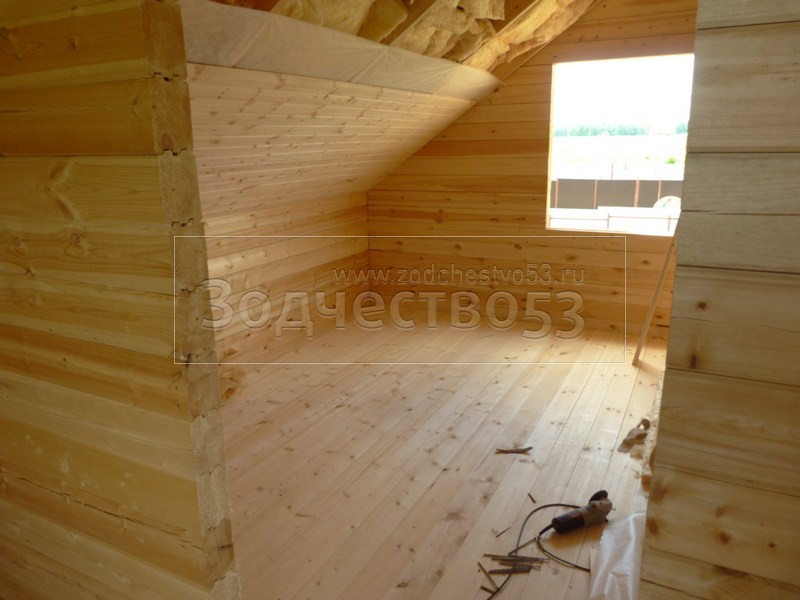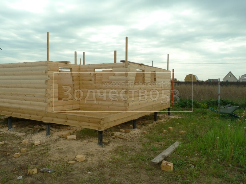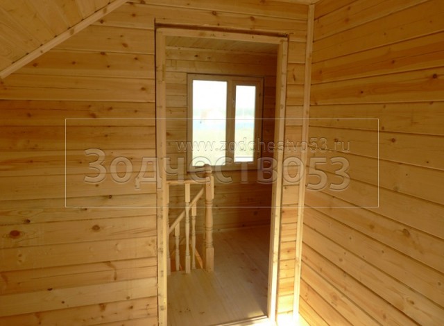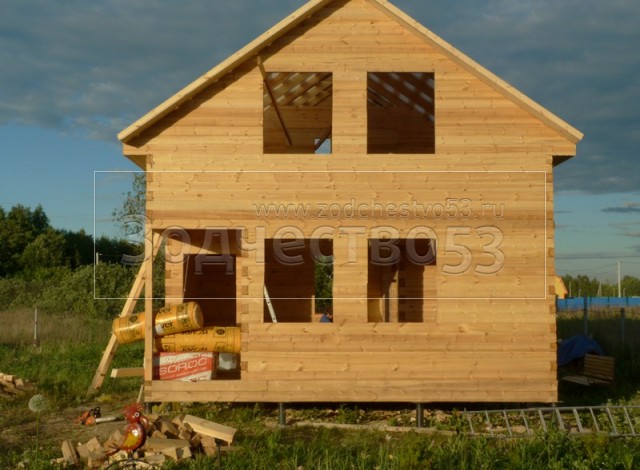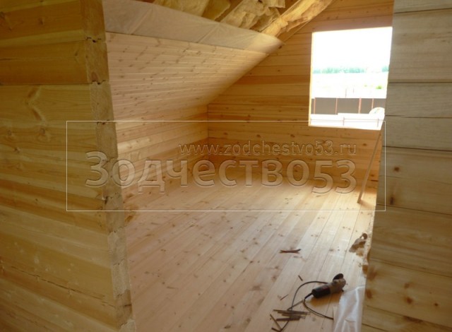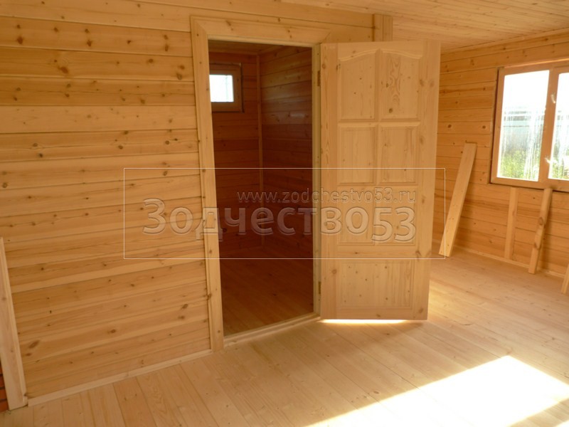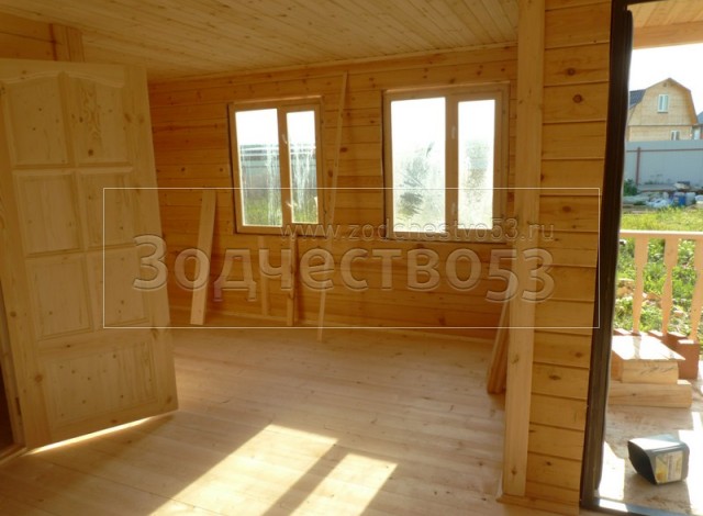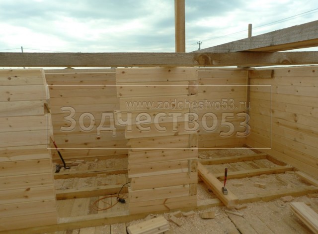- Сборка на гвозди в тёплый угол с проложкой джутового полотна (размер по полу 6×6) с выгородкой комнат по высоте 2.3м.