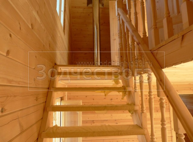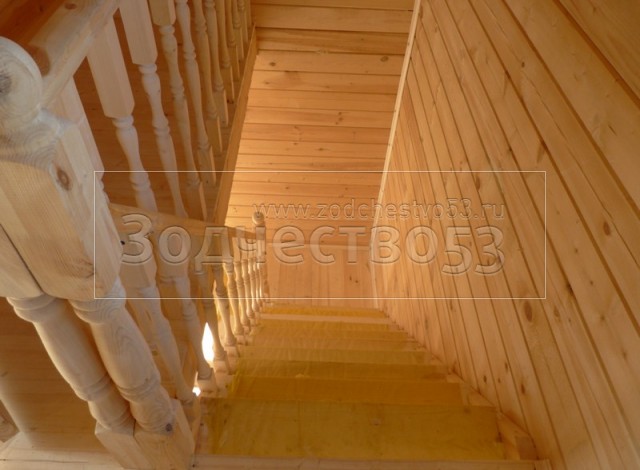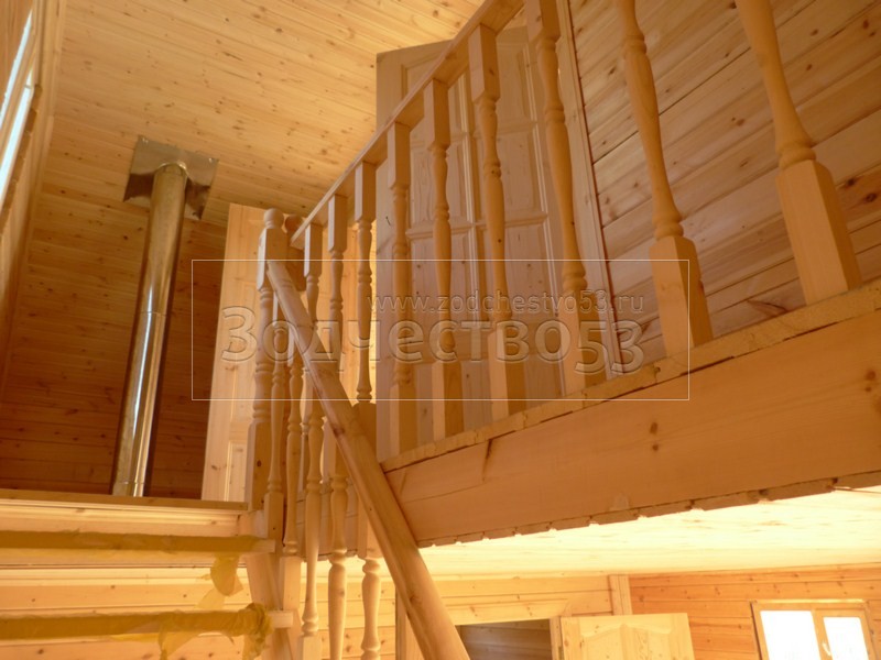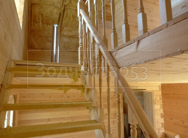 - Лестница двухмаршевая с точеными балясинами и перилами.