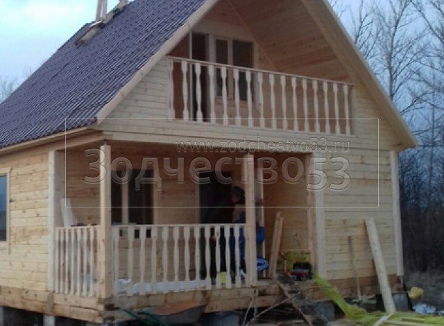 - Балкон открытый с установкой резных балясин подшит вагонкой по стропильной системе.