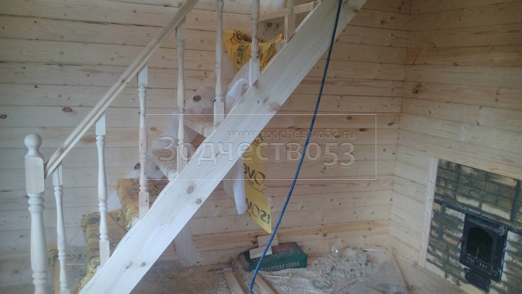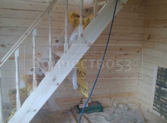 - Лестница одномаршевая с точеными балясинами и перилами.