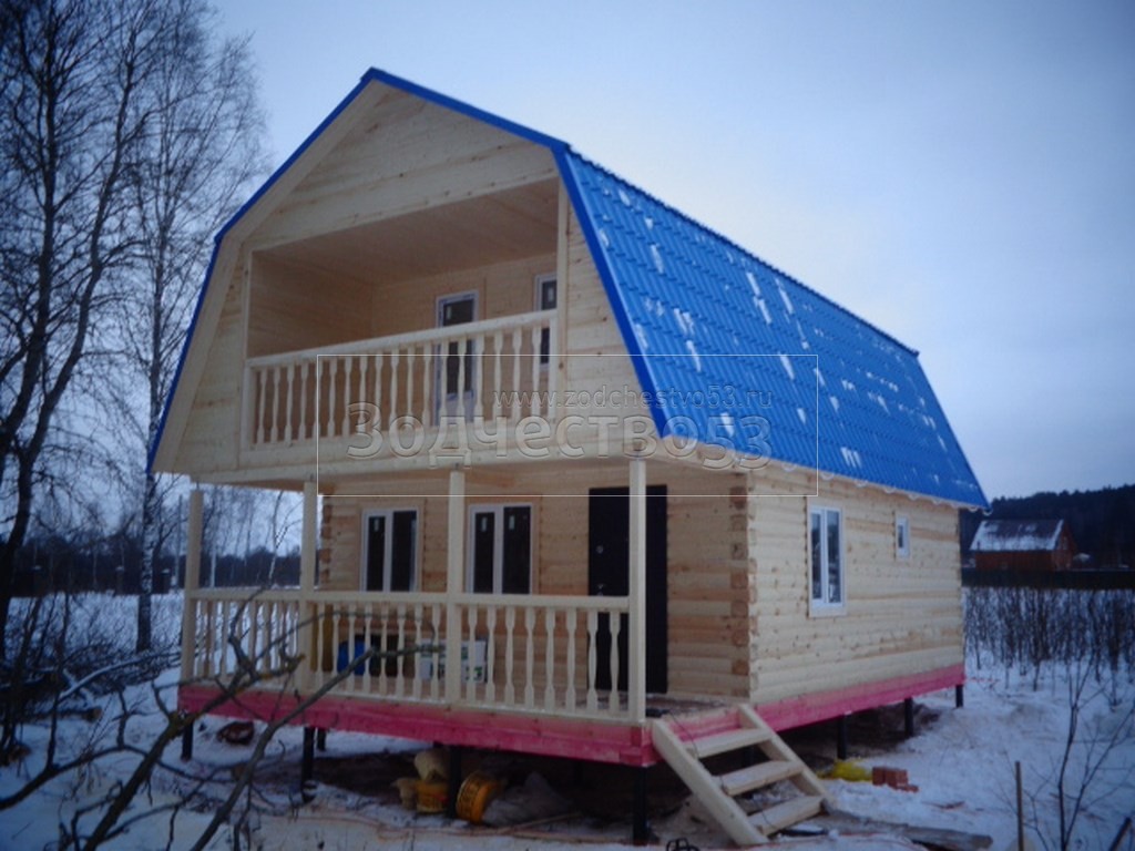 Баня 6,0х7,5 из профилированного бруса 150х200 и открытой верандой 2,0х6,0 под общей ломаной крышей. Построен в Московской области, Тарусский р-н. На сайте можно посмотреть проект: баня №1.