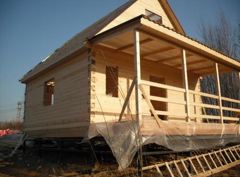 Баня общими размерами 6×8 (6×6 из профилированного сухого бруса 150×150 под двухскатной крышей и 2×6 открытая терраса под отдельной односкатной крышей)/ Построена: Московская область, г. Дмитров