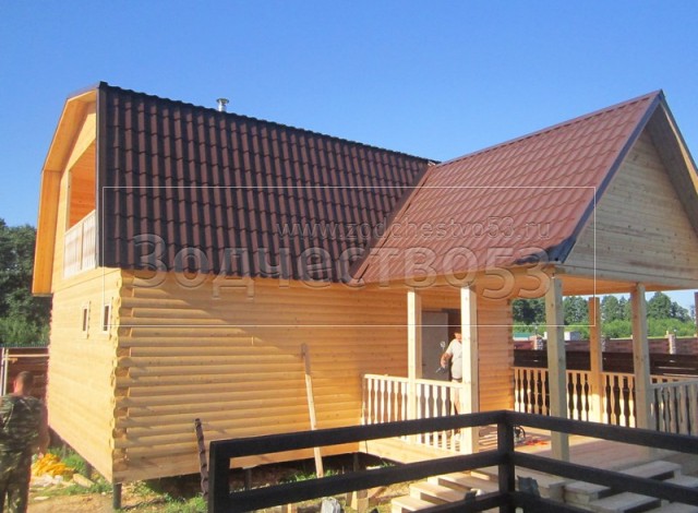 Баня 6×8 из профилированного бруса 200×150 под ломанной крышей и террасой 4×4 м. (буквой Г) под двухскатной крышей по проекту Годеция. Построена: Москва, Троицкий АО, Вороновское поселение