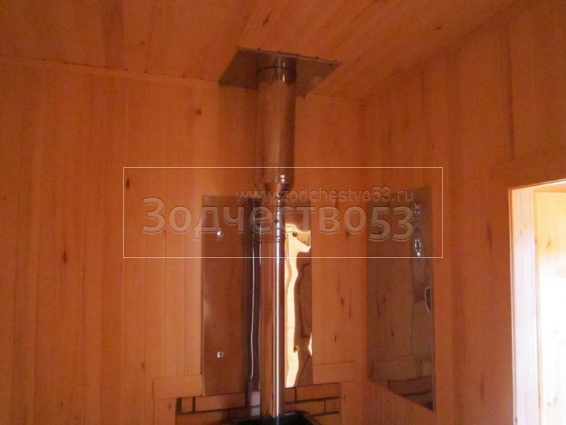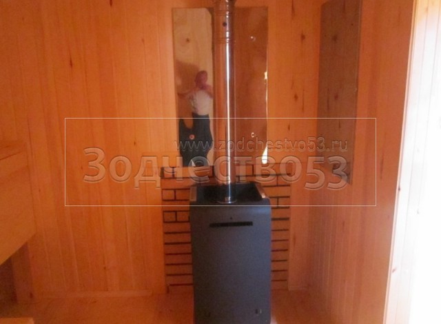 • Печь «Ермак 16 Элит со стеклом» с сендвич трубами через второй этаж, с обложкой печи из кирпича + бак под воду на 55 литров.