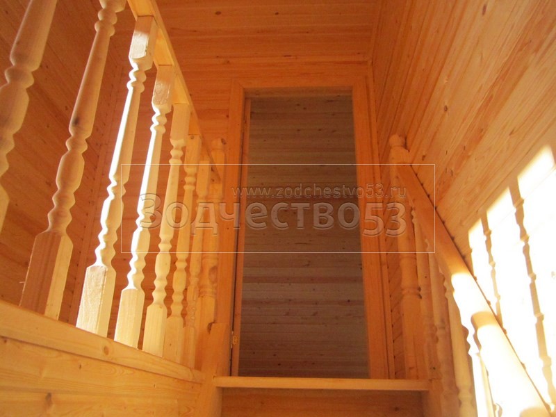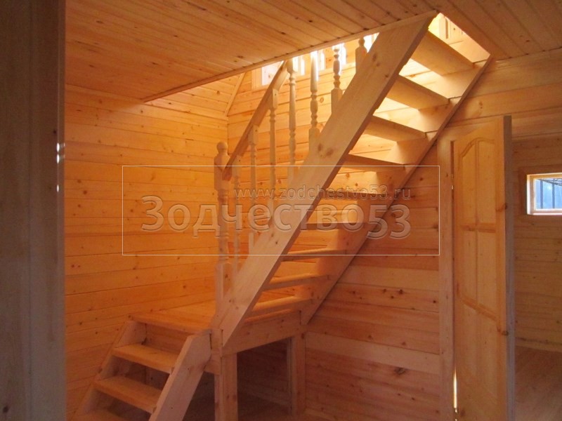 • Лестница двухмаршевая с точёными балясинами, стартовыми столбами и перилами.