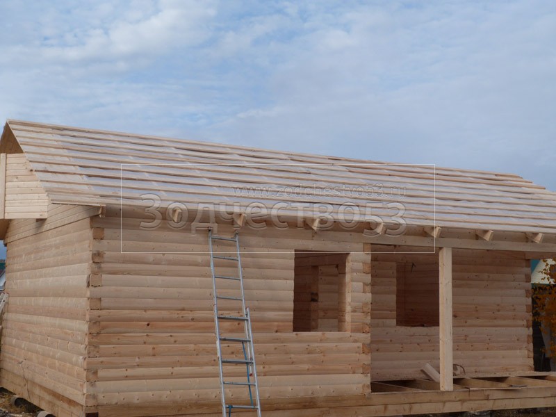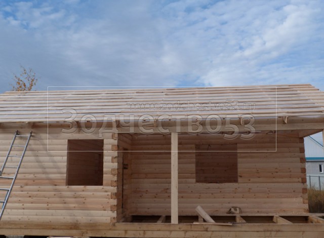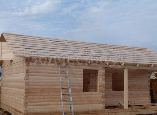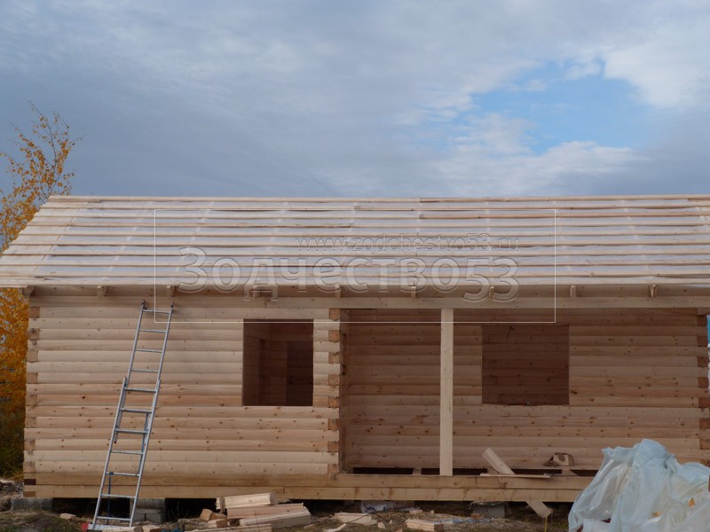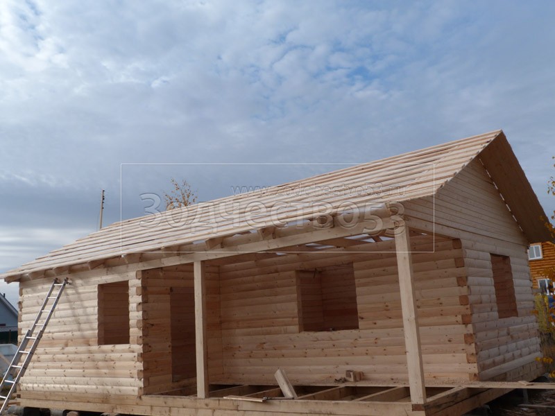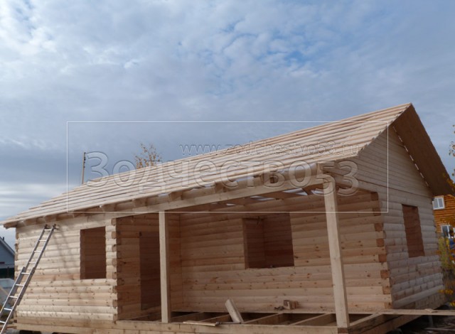 Баня 6×9 м. из профилированного бруса 150×150 под общей двухскатной крышей. Построена октябре 2014 года в республике Татарстан, Лаишевский районе, с. Столбище.