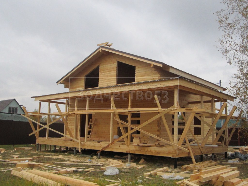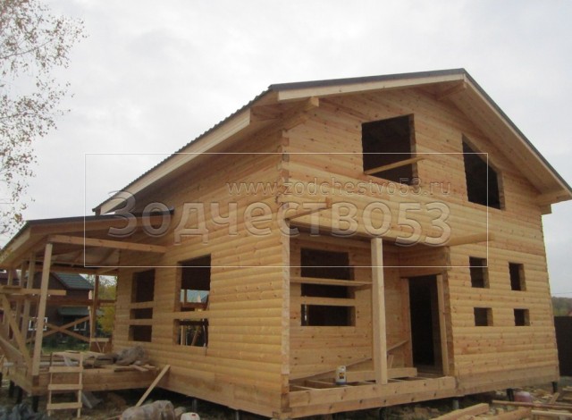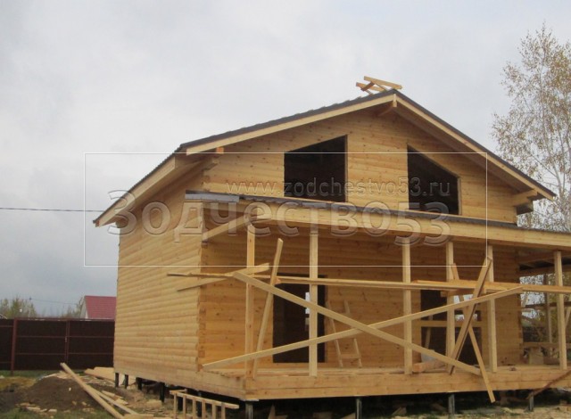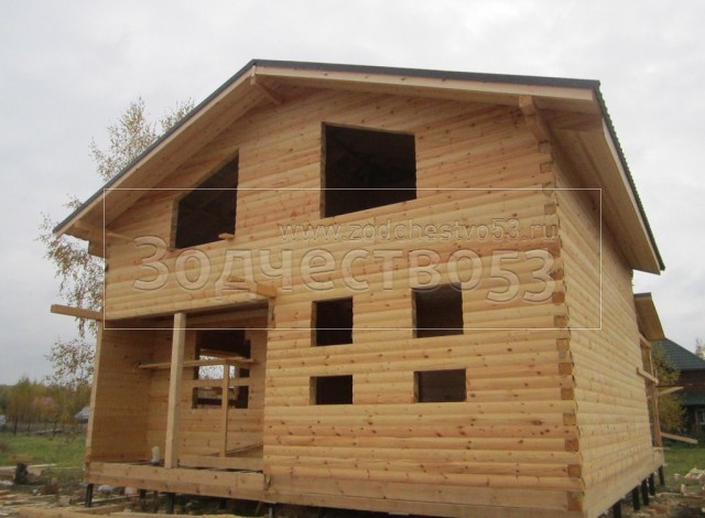 Cруб дома 8.0×8.5 из профилированного бруса 150×150 полутороэтажный с брусовыми фронтонами под двухскатной крышей по проекту Д-83. Построен: Московская область, Раменский район.