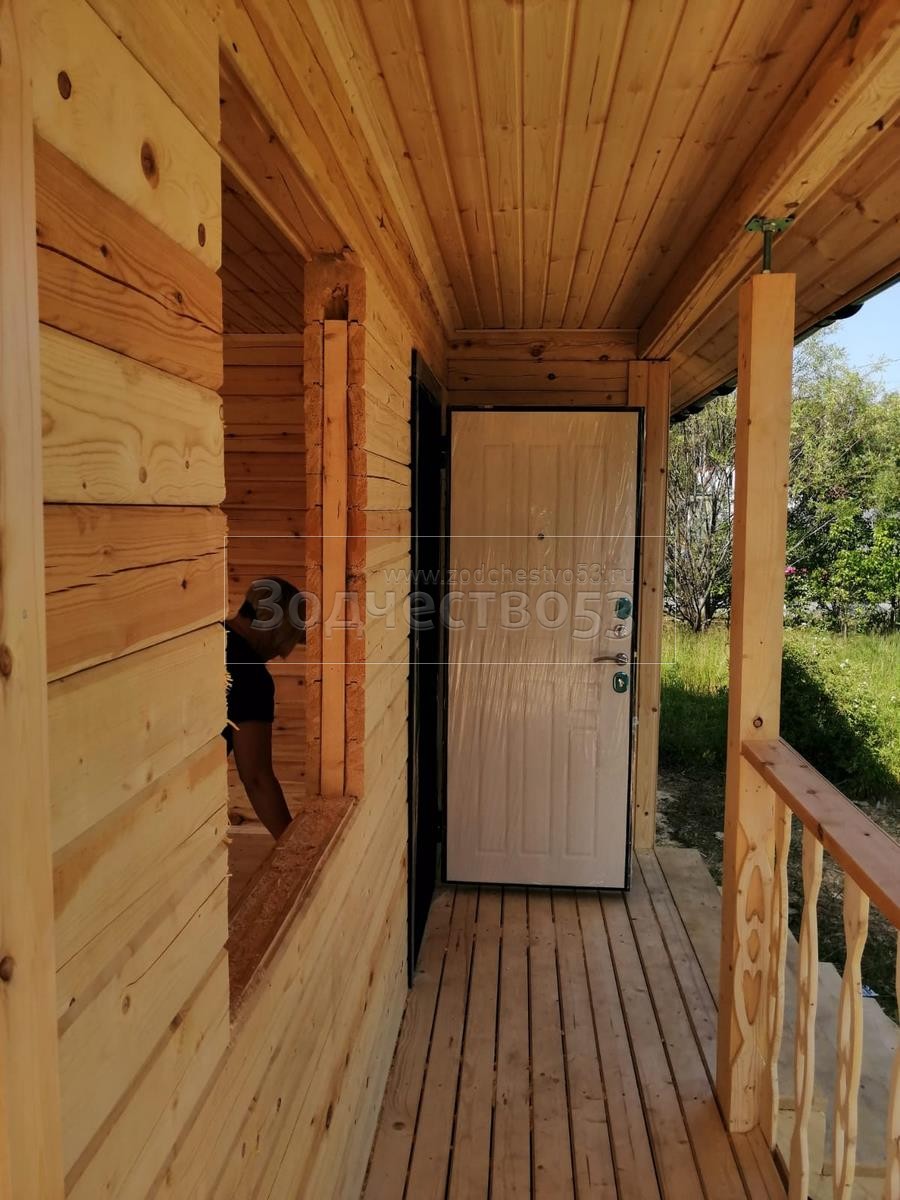 - Терраса Г образная: открытая, с резными балясинами и перилами. Потолки подшиваются Вагонкой ( по стропилам)