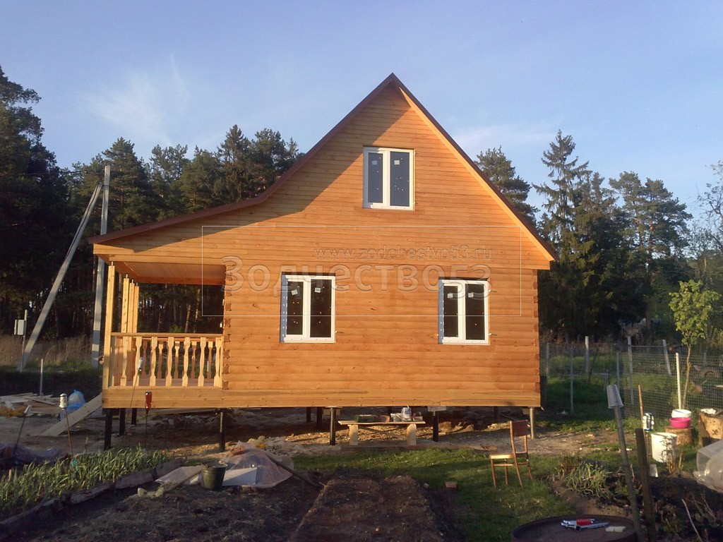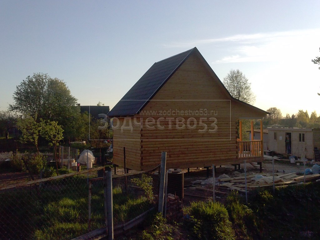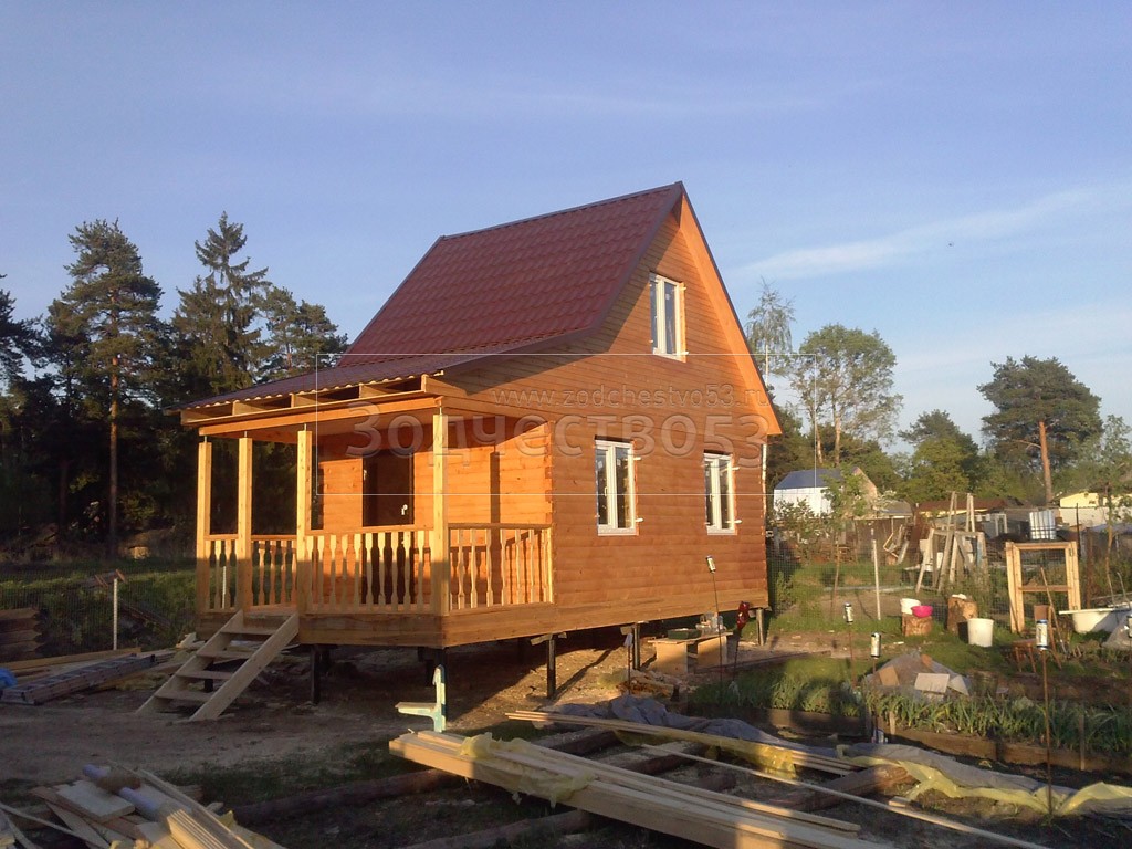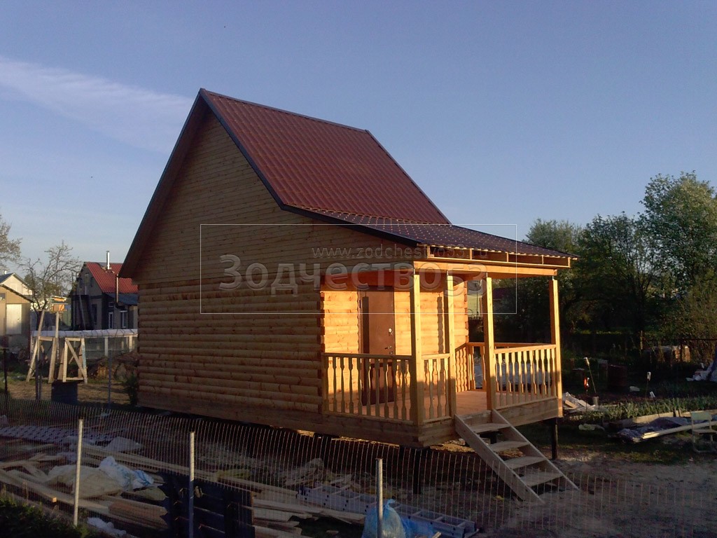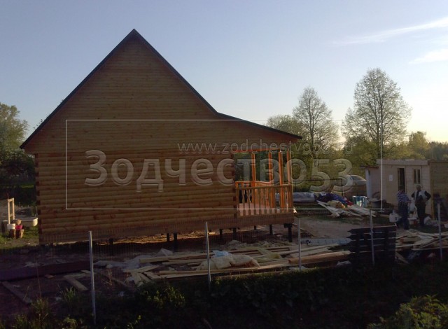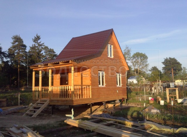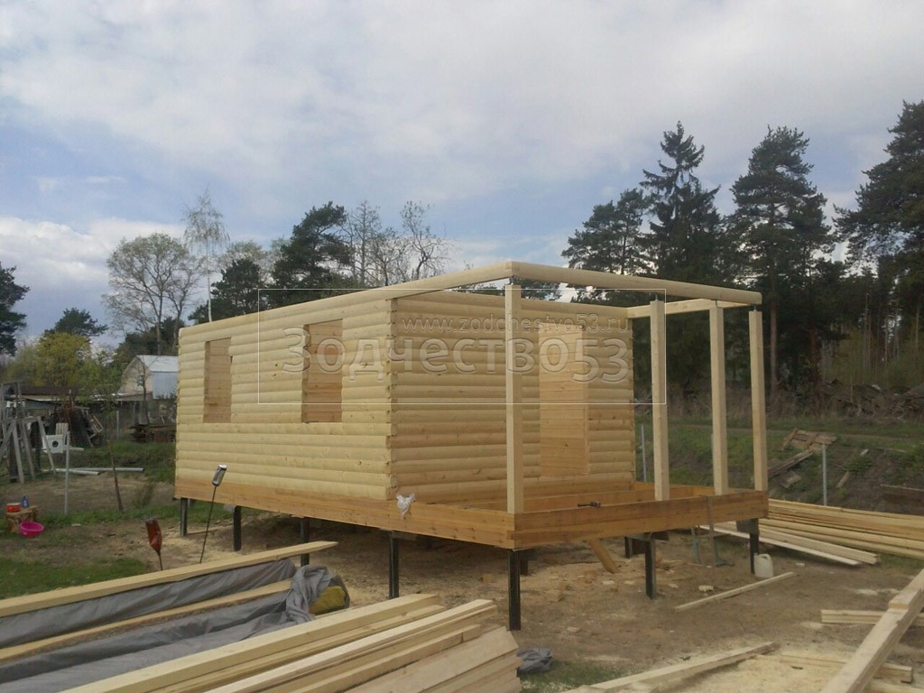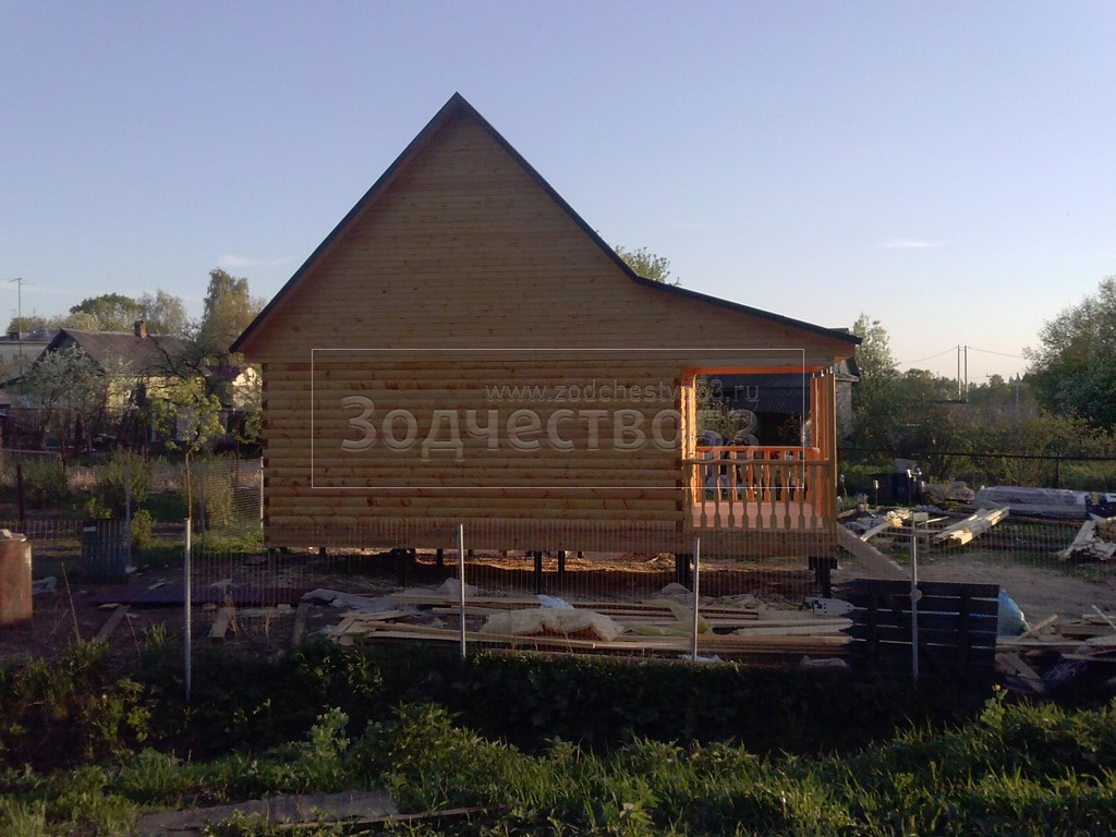 Двухэтажный дом 6,0х4,0 из профилированного бруса 100х150 под двухскатной крышей и терраса 2,0х4,0 открытая под отдельной односкатной крышей. Место строительства: Московская обл., Дмитровский р-н