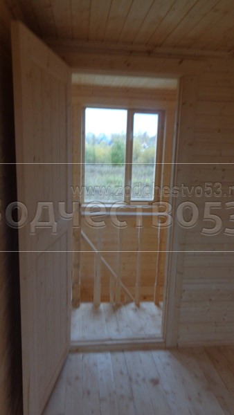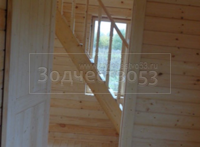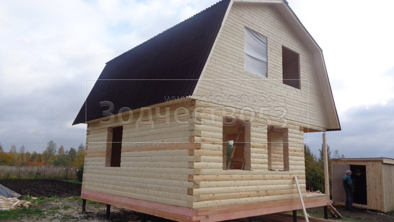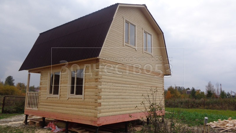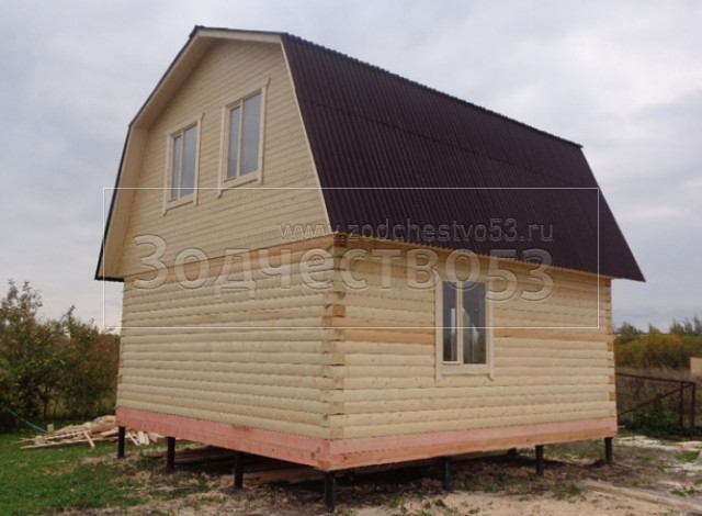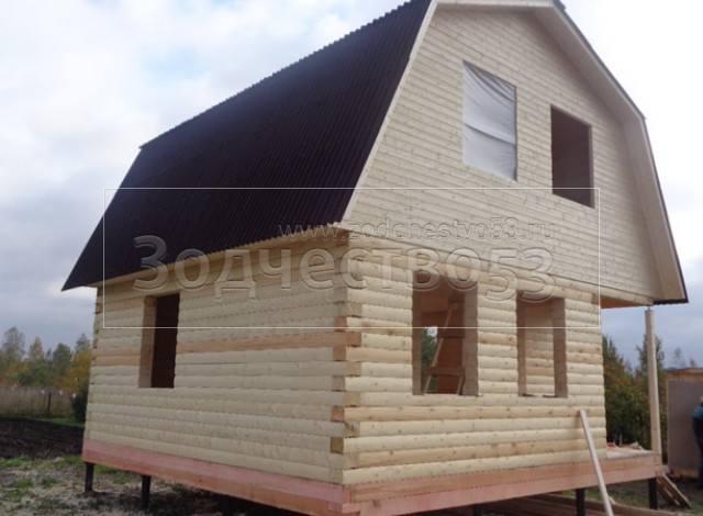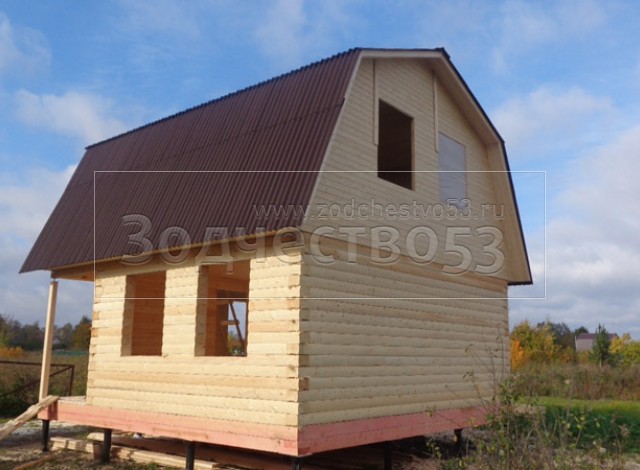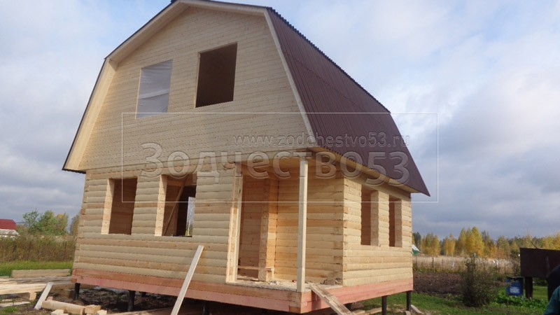 Дом 6×6 по проекту Д-16 из профилированного бруса 200×150 и крыльцом 1.5×1.5 под общей ломанной крышей. Построен сентябре-октябре 2013 года в Ленинградской области, Гатчинском районе