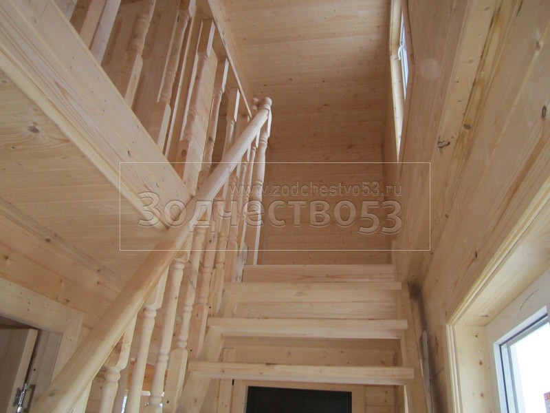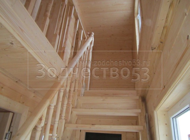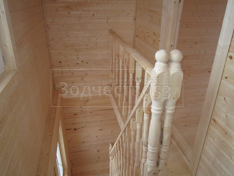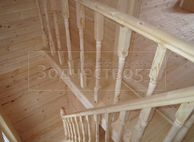 - Одномаршевая лестница с точёными балясинами, перилами и стартовыми столбами.