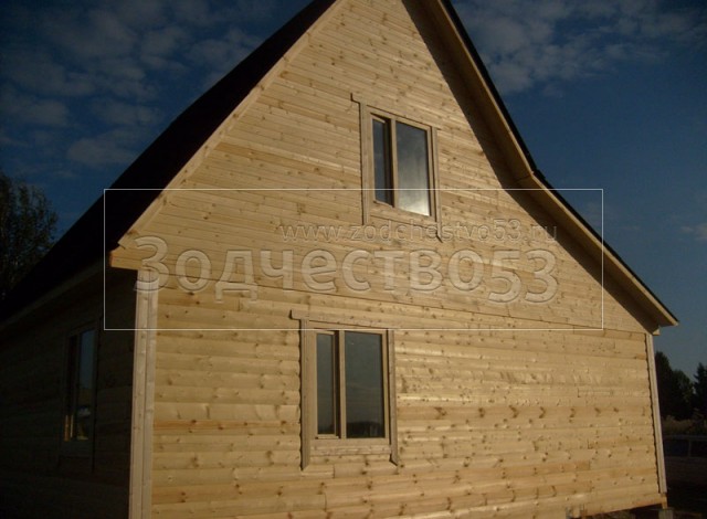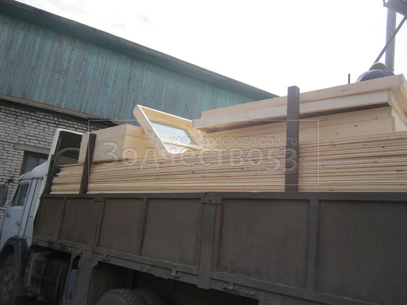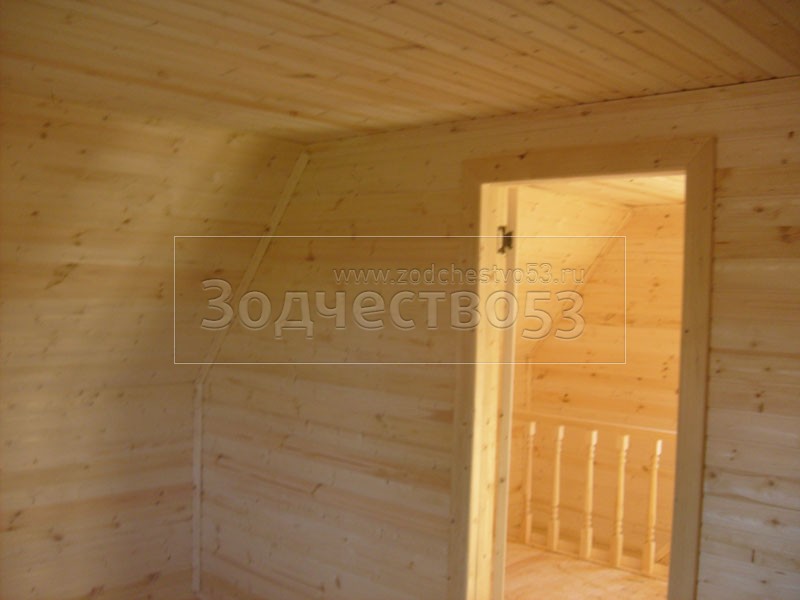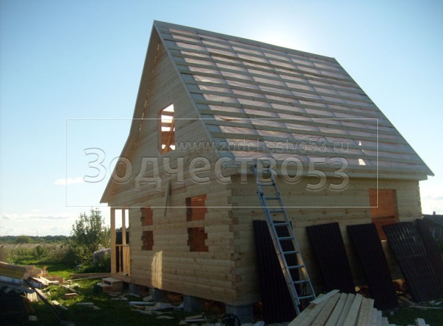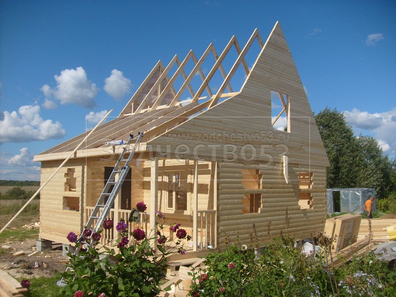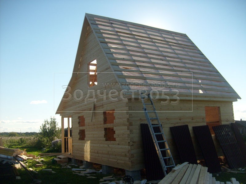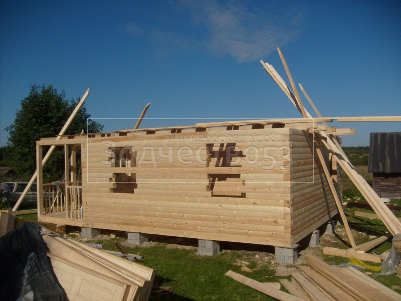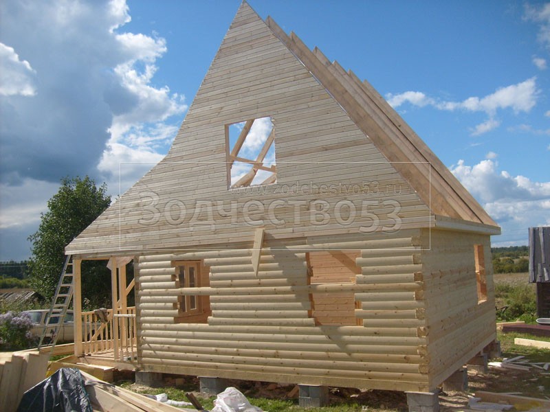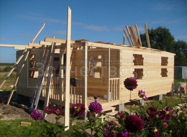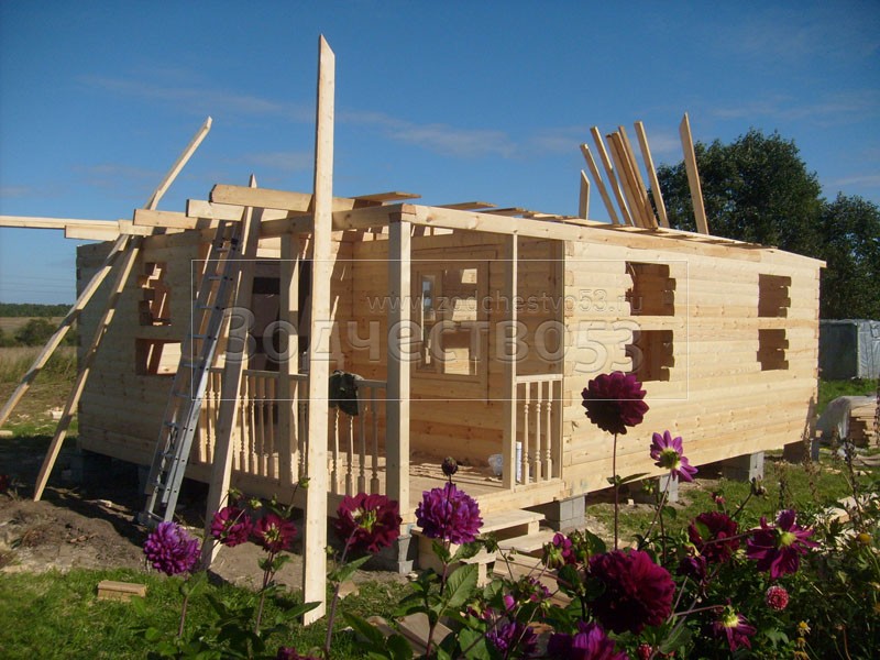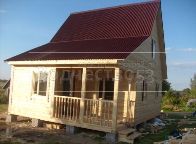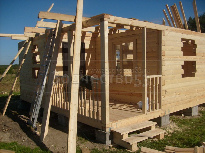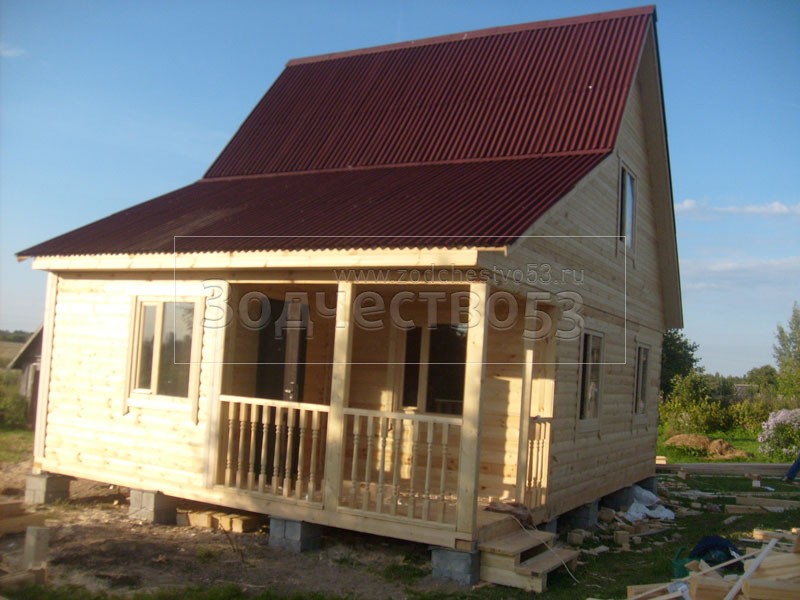 Дом 6×6 м. по проекту Д-25 из профилированного бруса 150*150 с верандой 2*6 под отдельной крышей (2*3 брусовая и 2*3 с резными балясинами)