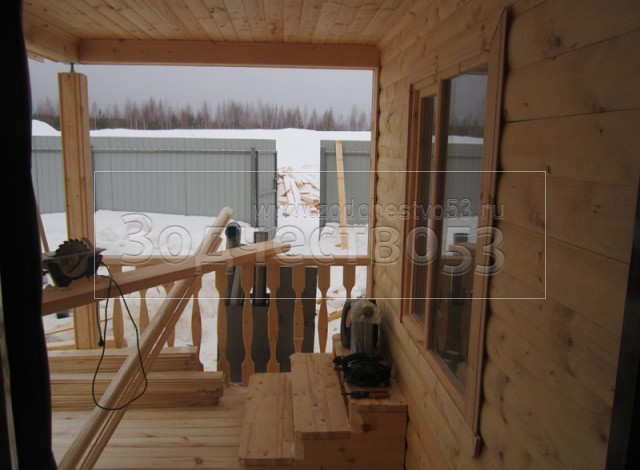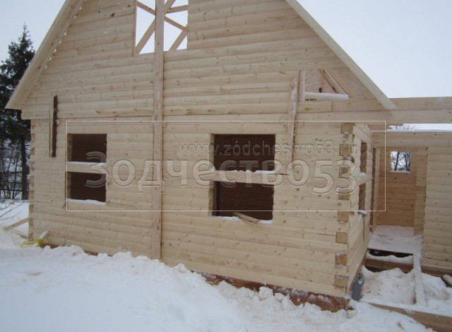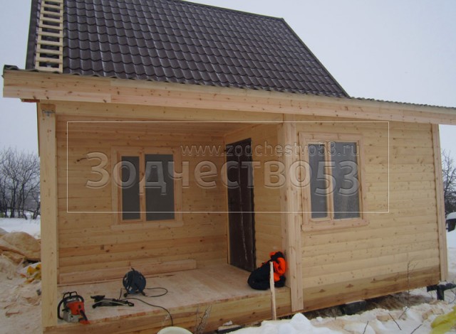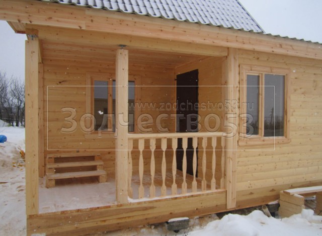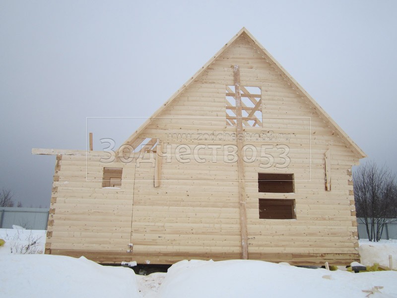 Дом из бруса общими размерами 6×8 м. по проекту Д-25 из профилированного бруса 150×150 (дом 6×6 под двухскатной крышей,открытой террасой 3×2 и брусовой закрытой террасой 3×2 под отдельной крышей). Построен в Нижегородской области, Арзамасском районе.