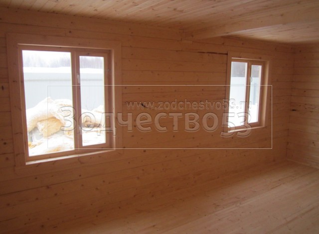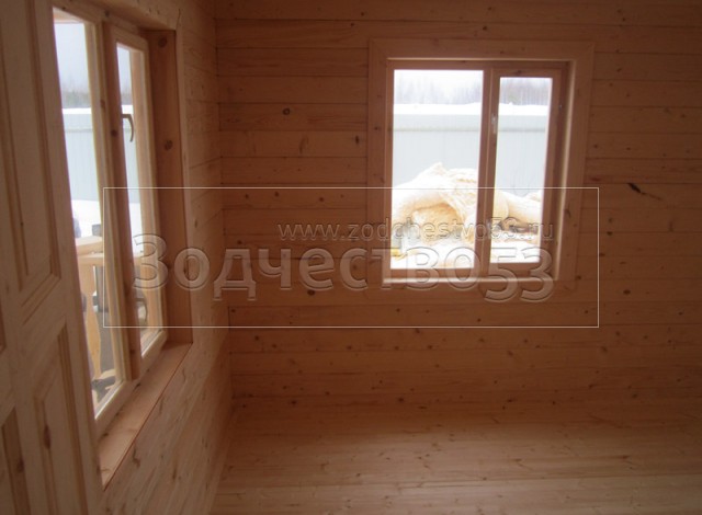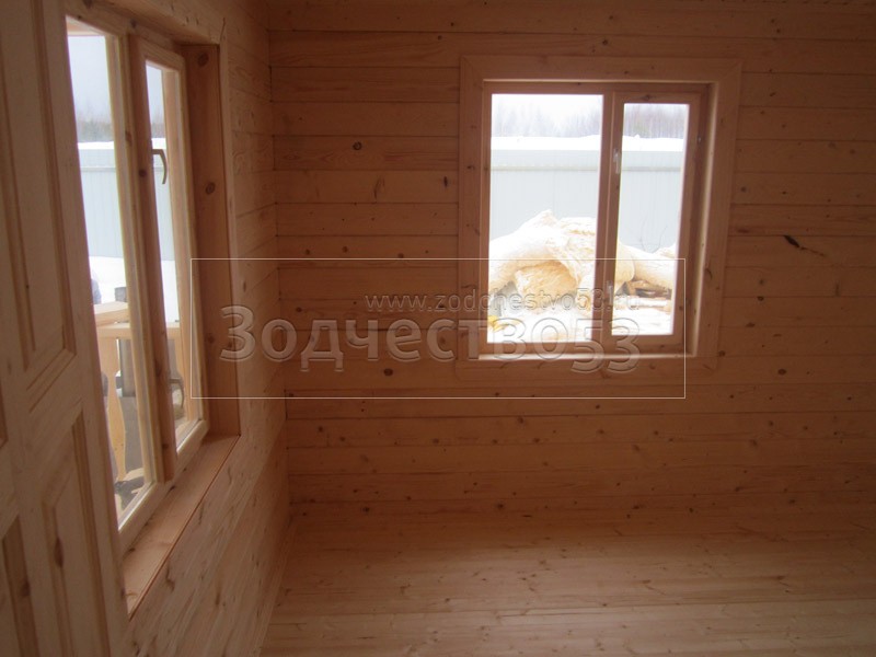 - Окна: 8 шт. — деревянные, имитация стеклопакетов.