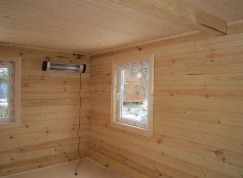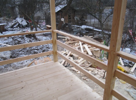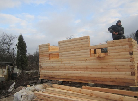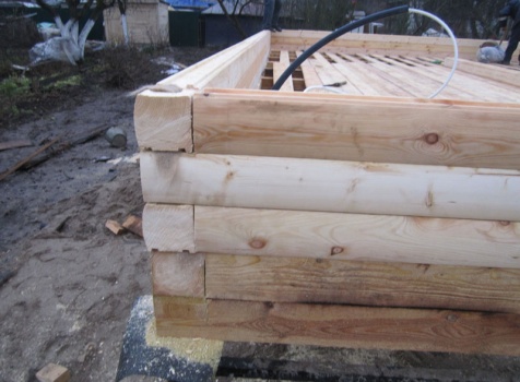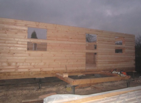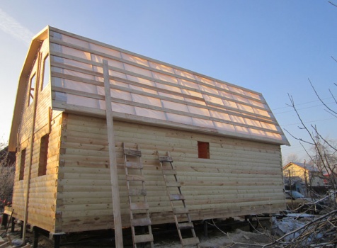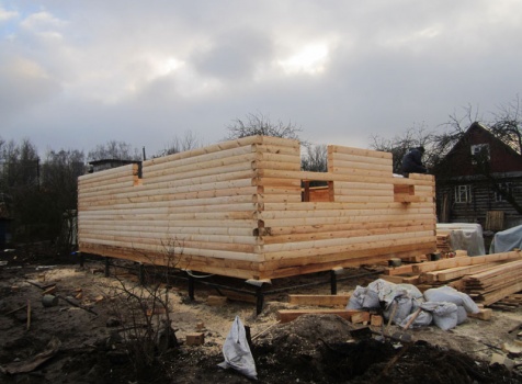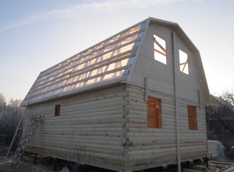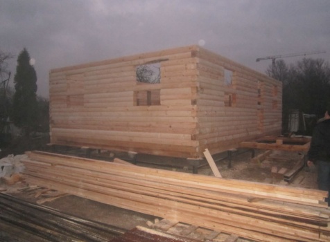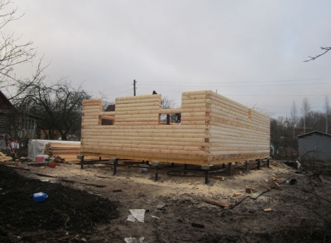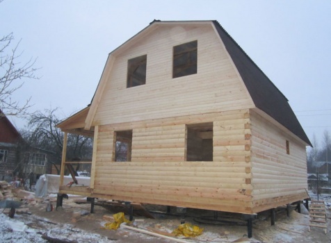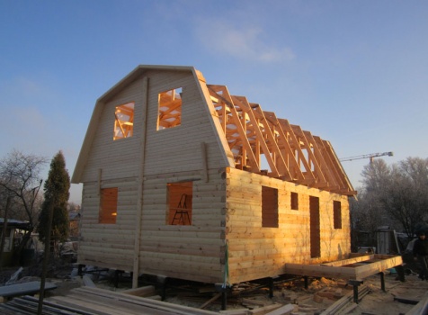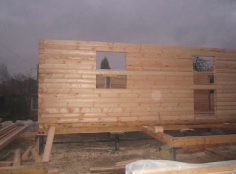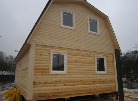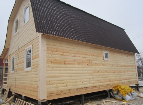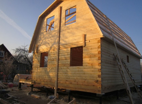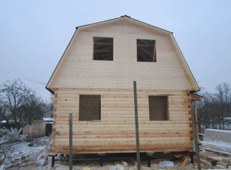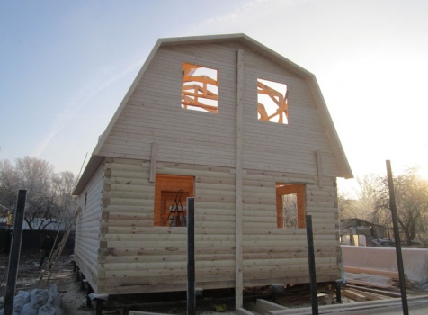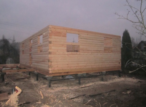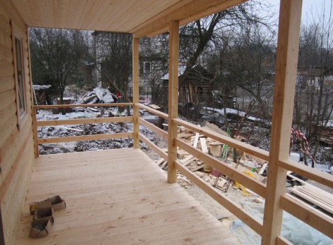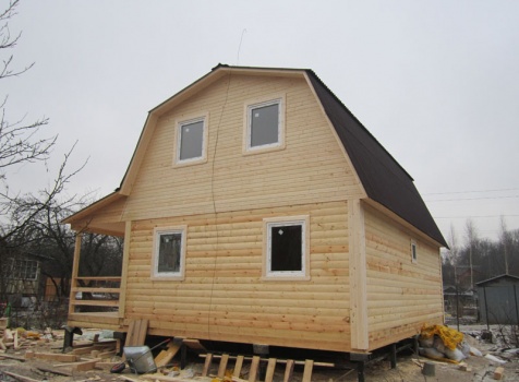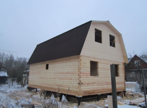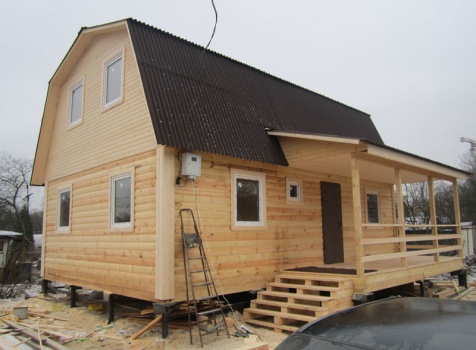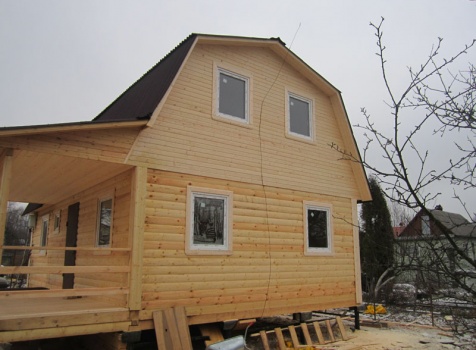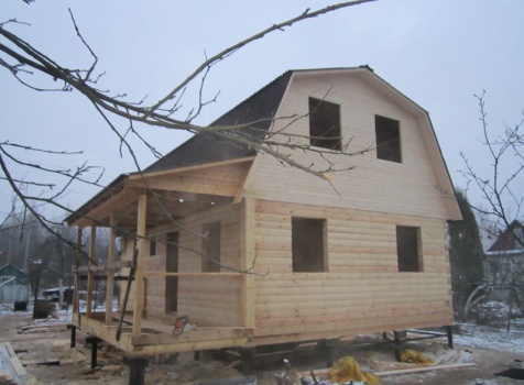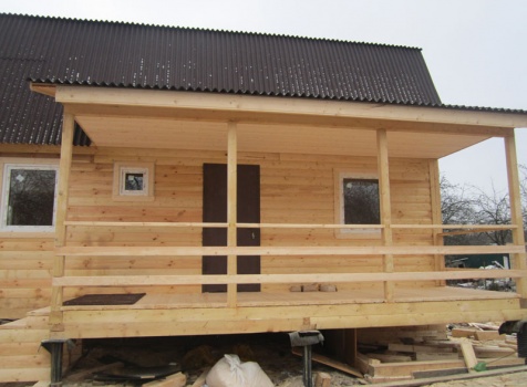 Дом 6×9 из профилированного бруса 150×150 под ломанной крышей с открытой верандой 2×3 под отдельной крышей (во время строительства дома заказчиком были внесены изменения по размерам веранды, веранда в итоге получилась размерами 2×4). Построен в ноябре 2014 г. в г. Санкт -Петербурге, Пороховые, Садоводство № 1.