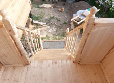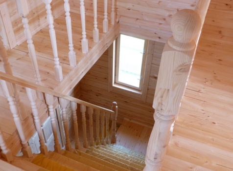 • Лестница: двухмаршевая с подиумом, с резными балясинами и перилами.