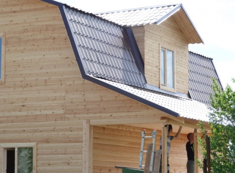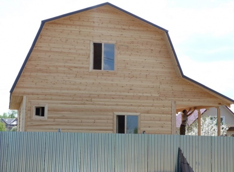 Дом 6×9 из профилированого бруса 150×150 под ломанной крышей с кукушкой (ширина 2.5,высота 2.0 м) и крыльцо 2.0×6.0 открытое под отдельной крышей. Построен: Московская область, Мытищинский район, д. Свиноедово.