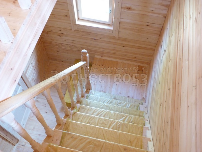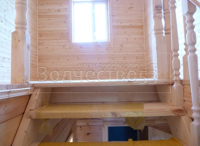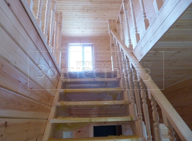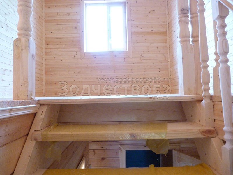- Лестница: двухмаршевая с подиумом, с резными балясинами и перилами.