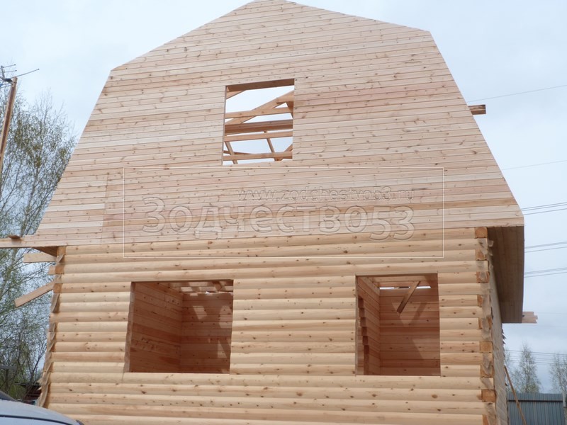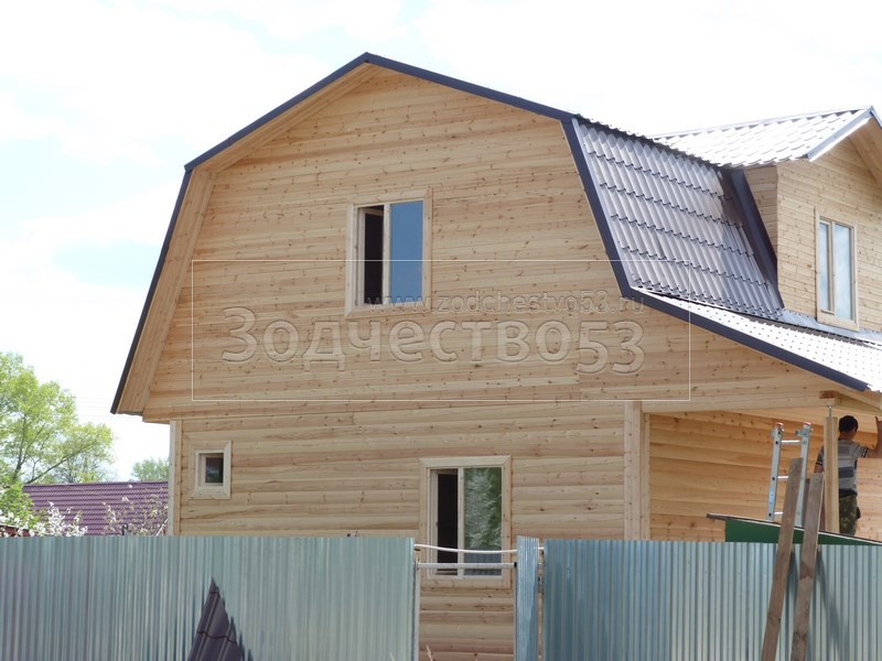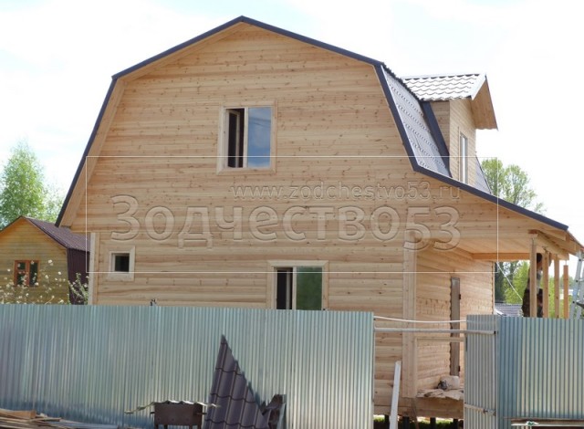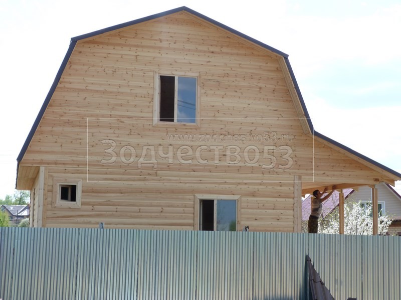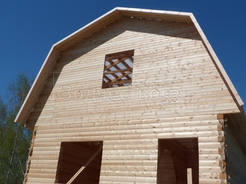 Дом 6×9 из профилированого бруса 150×150 под ломанной крышей с кукушкой (ширина 2.5,высота 2.0 м) и крыльцо 2.0×6.0 открытое под отдельной крышей. Построен: Московская область, Мытищинский район, д. Свиноедово.