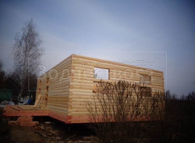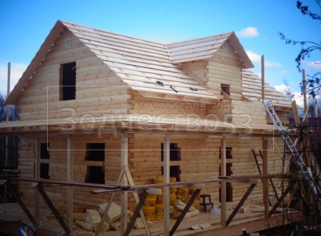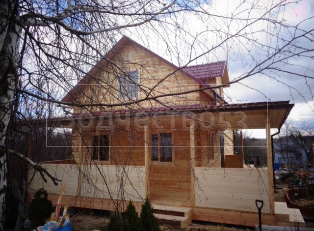 Полутораэтажный дом 6,0х9,0 из профилированного бруса 150х150 под двухскатной крышей и терраса буквой Г. Построен в Московской области, Каширский р-н. На сайте можно посмотреть проект Д-34.