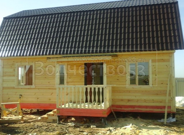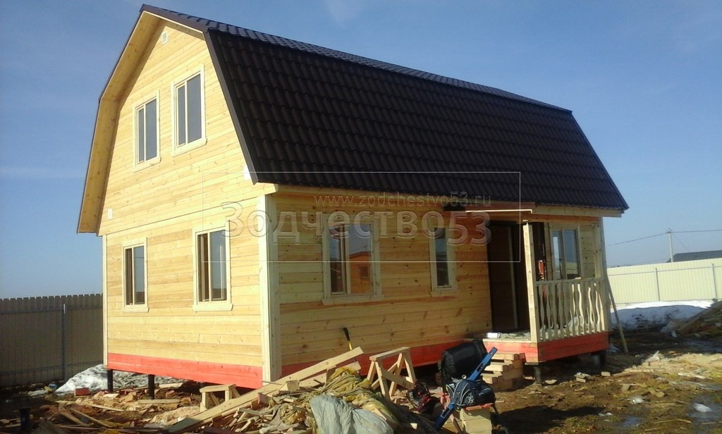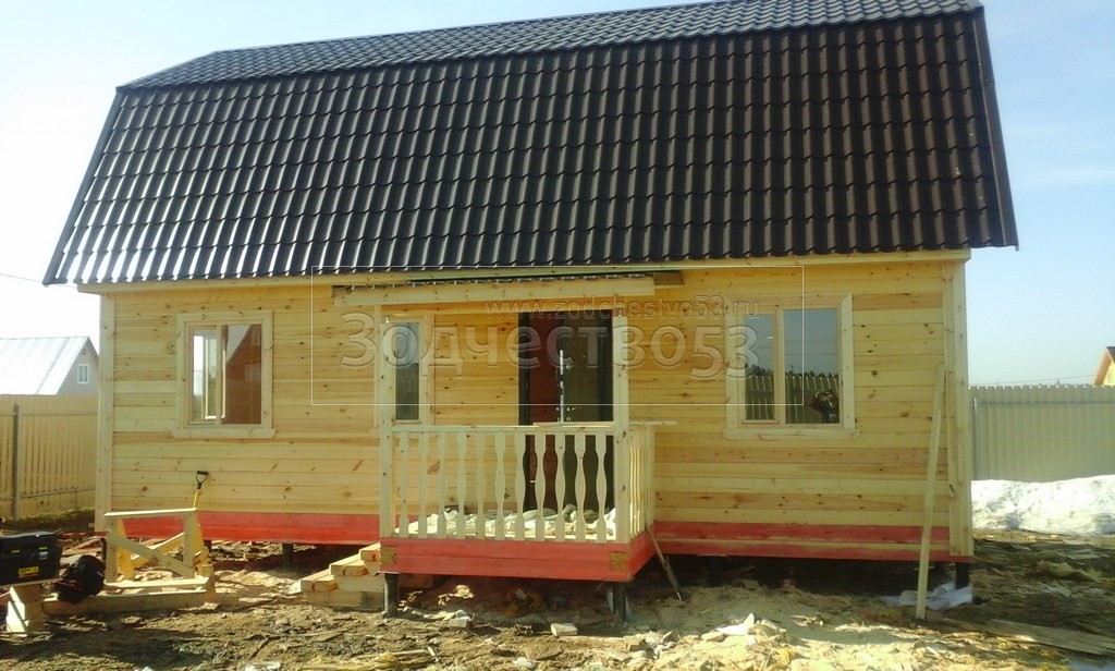3,20-3,40 каркасно-щитовые, обшиваются вагонкой - крыша ломаная 6,0×9,0 (дом) и крыльцо — 2,0×1,50 прямая односкатная, покрыта металлочерепицей