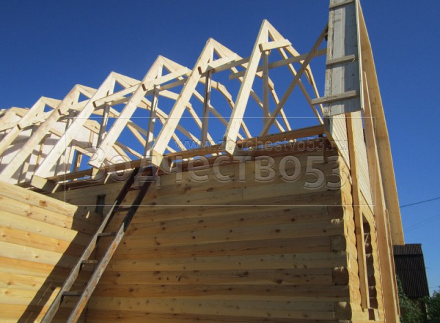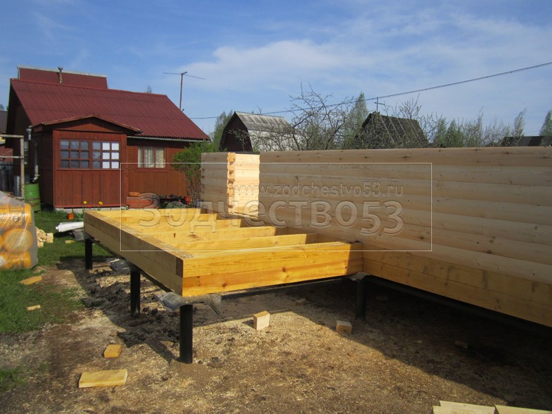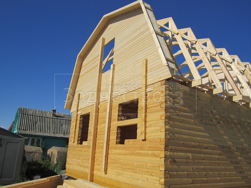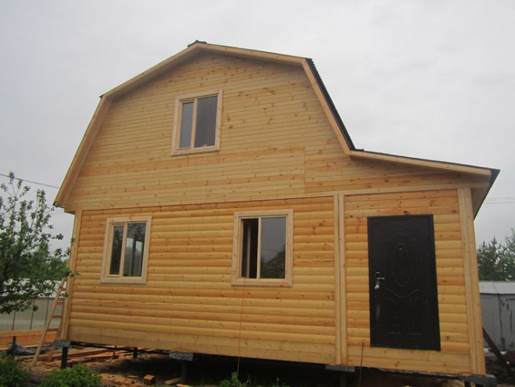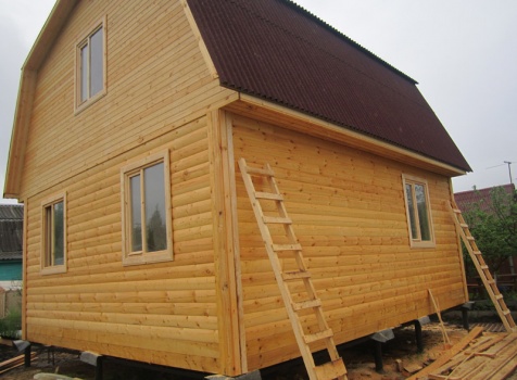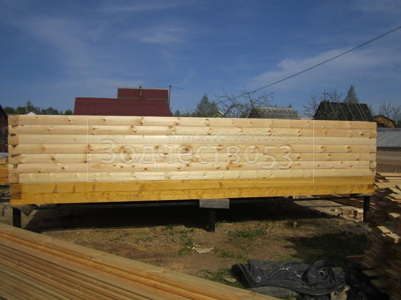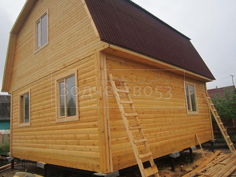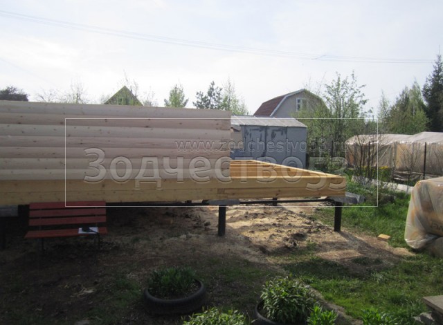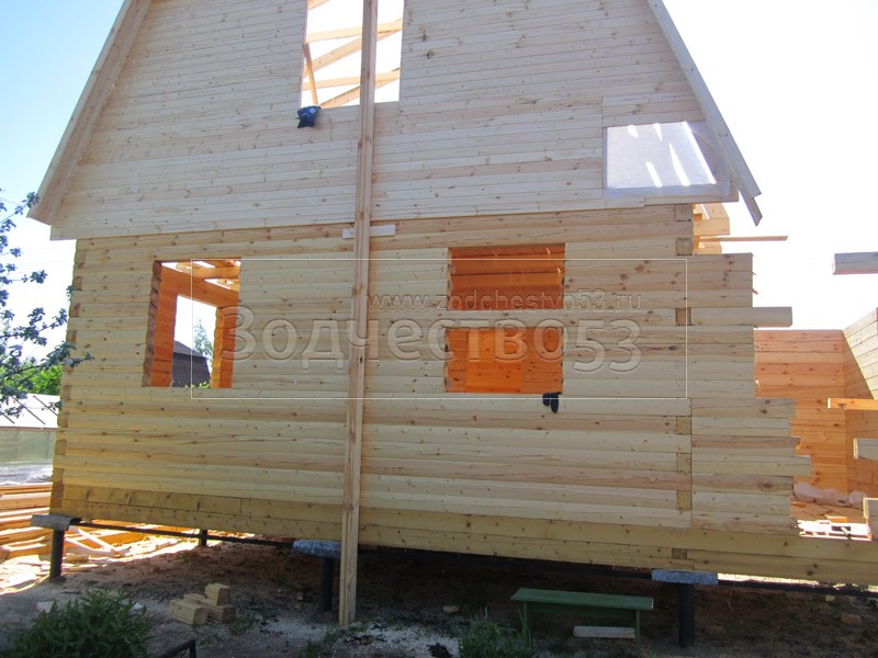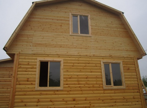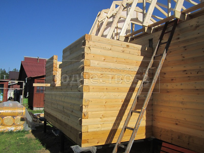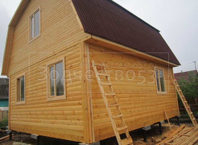Дом 7×8 по проекту Д-44 из профилированного бруса 150×150 (6×7 под ломанной крышей и 2×4 под отдельной односкатной крышей). Построен в Ленинградской области, Всеволожский район, посёлок Морозово
