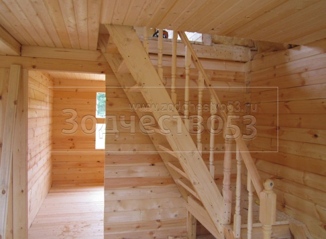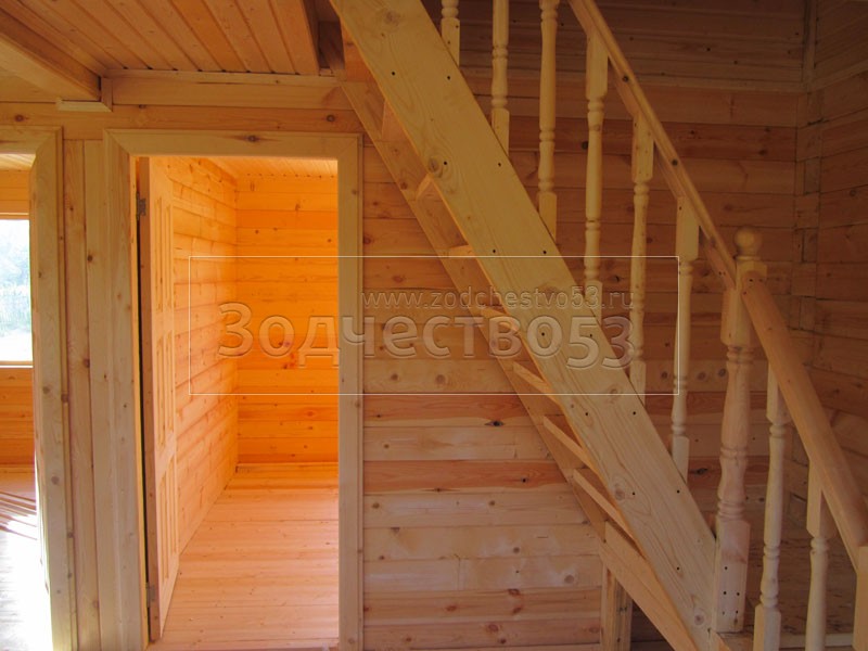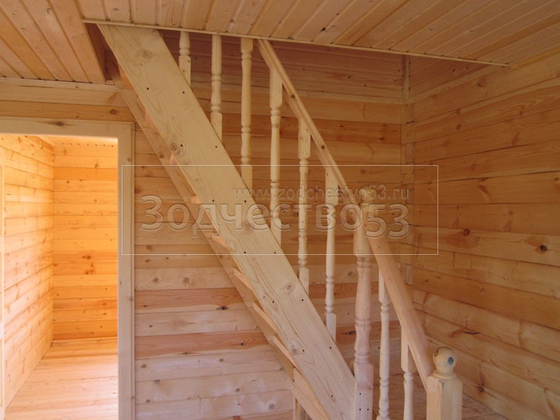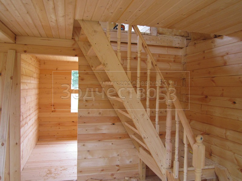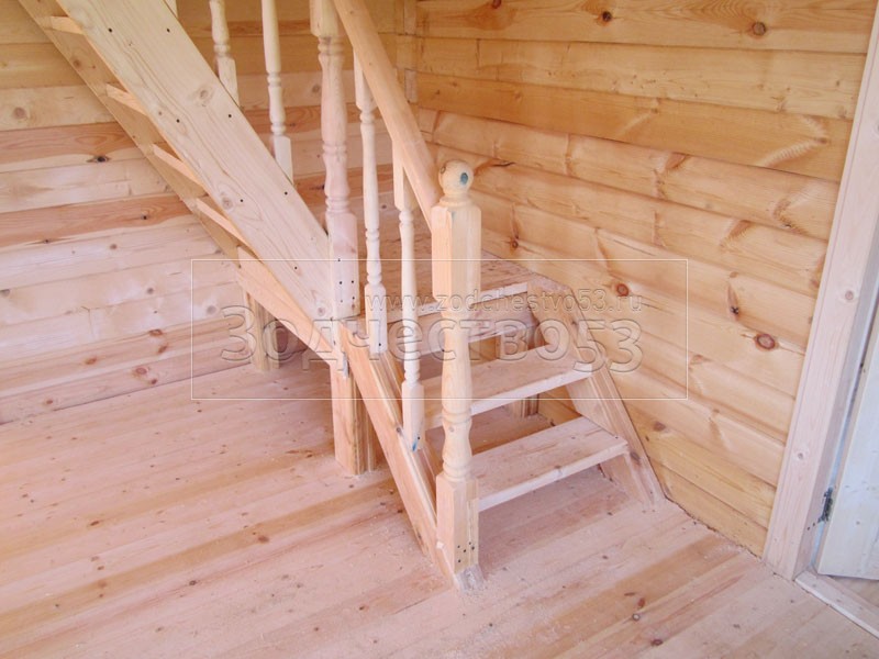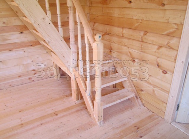 - Установка двухмаршевой лестницы с точёными балясинами.