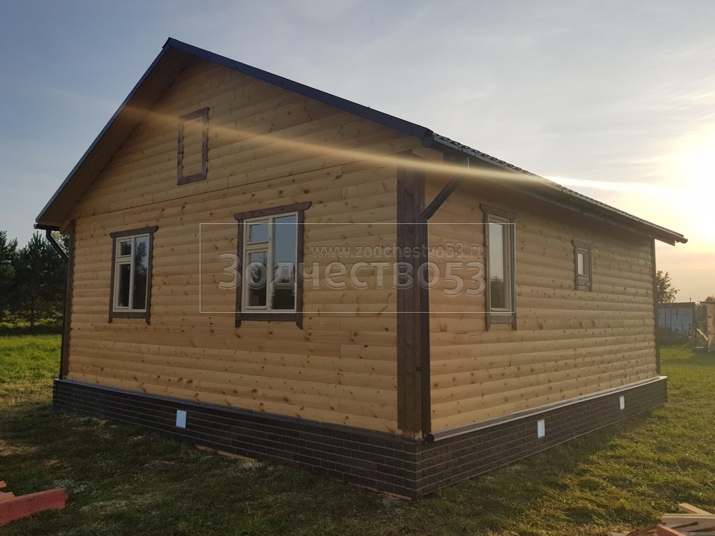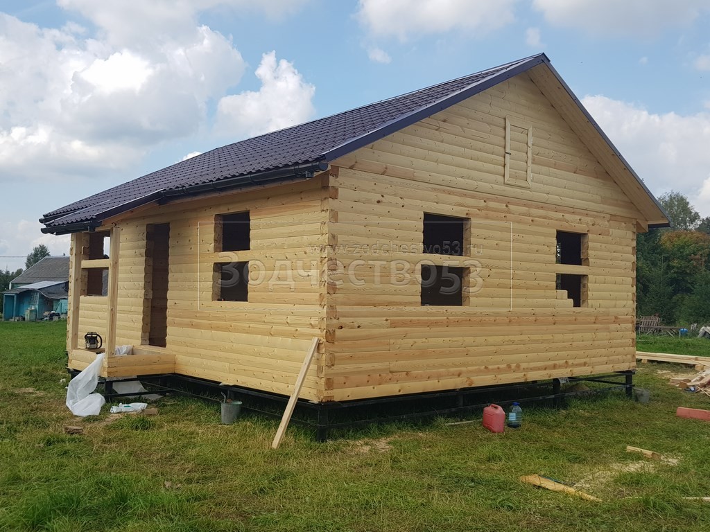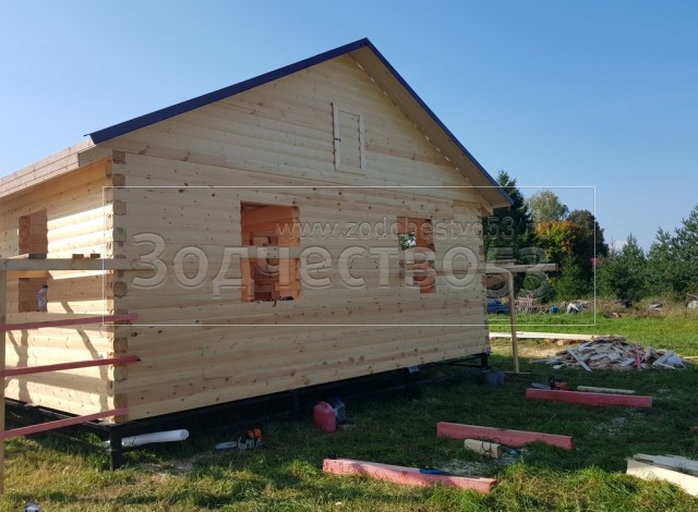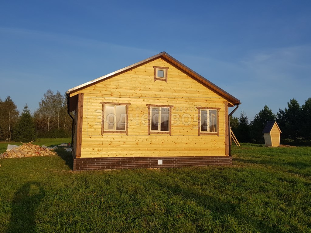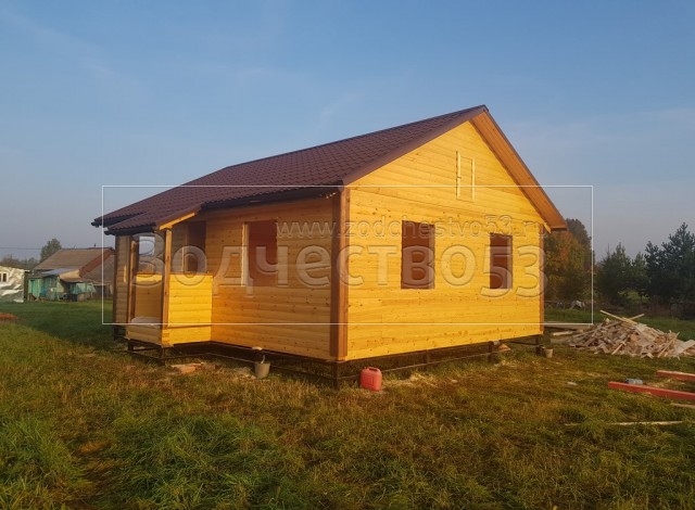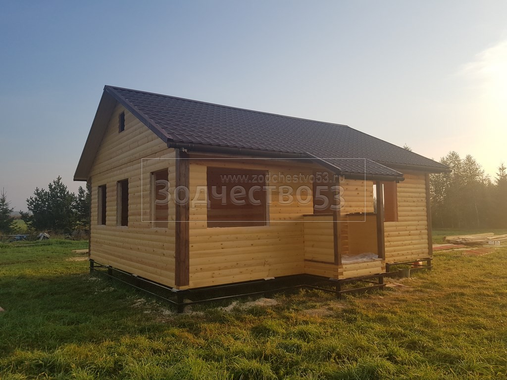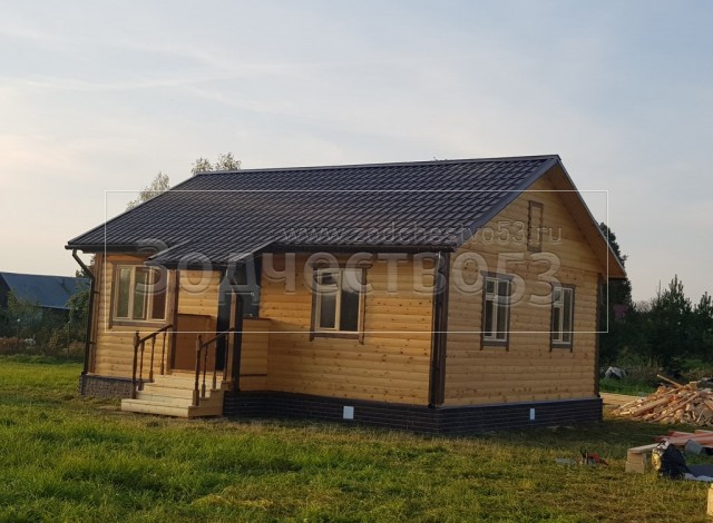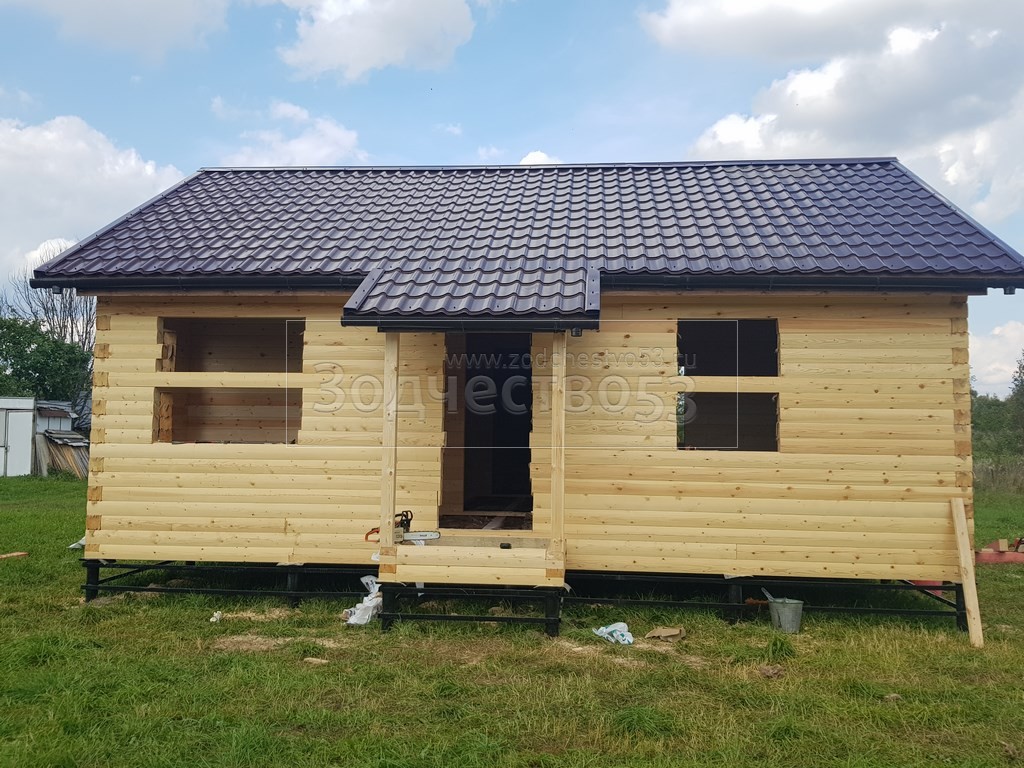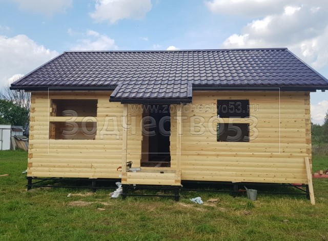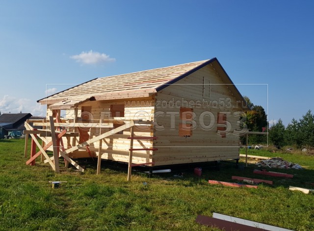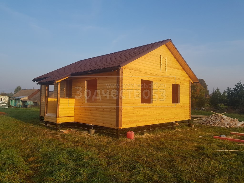 Одноэтажный дом общими размерами 7.0х8.0 из профилированного бруса 140х140 (камерной сушки) под двухскатной крышей и открытой террасой 1.50х1.0 м., под отдельной односкатной крышей. Объект построен: Московская обл., Можайский район, д. Шохово, д. 20б.