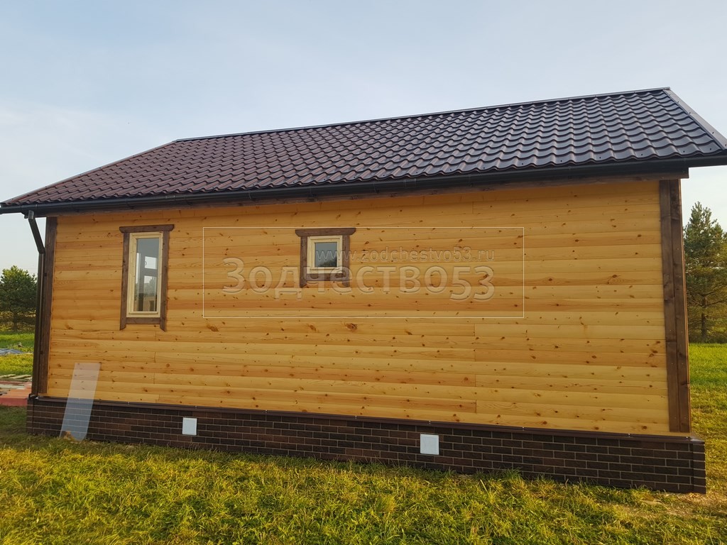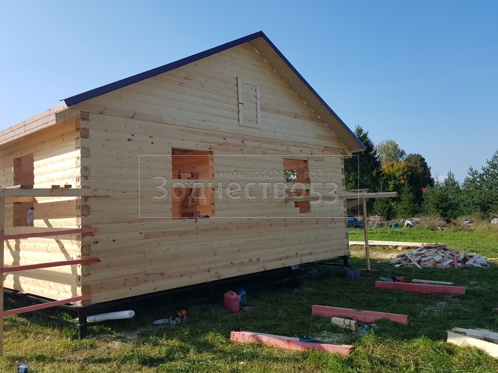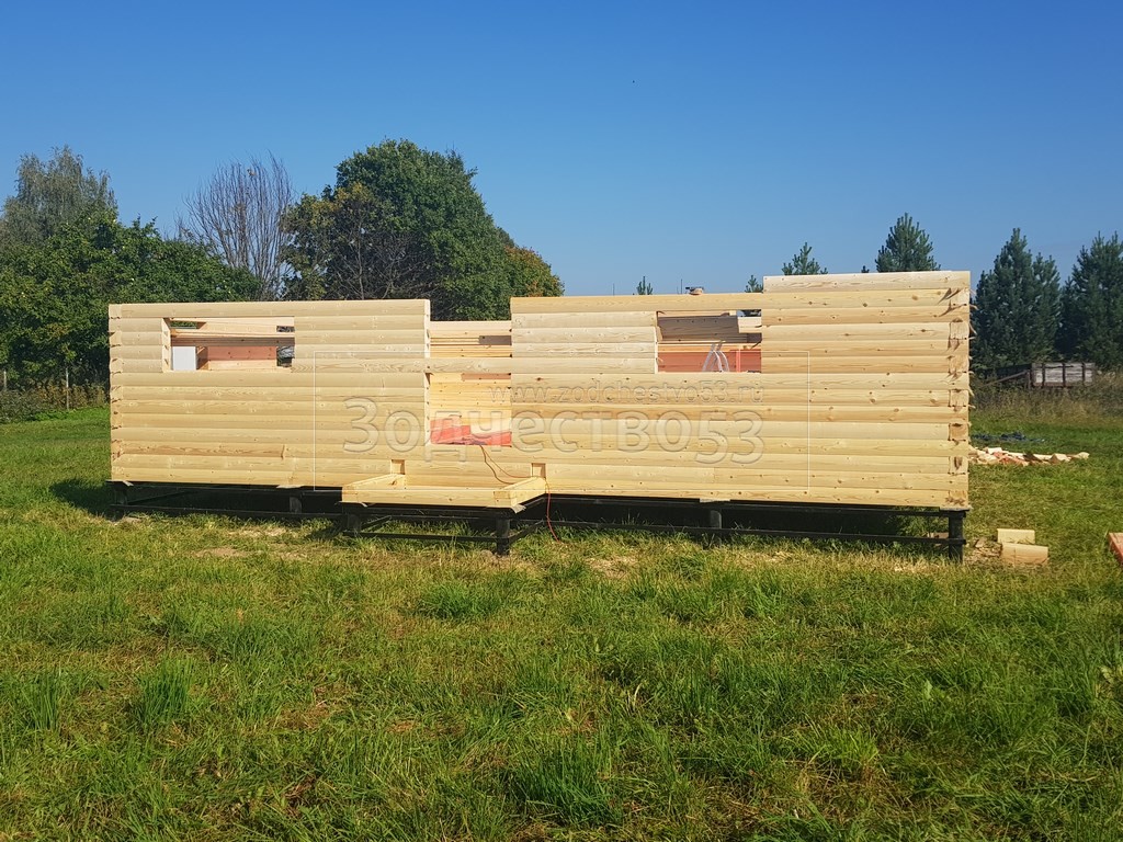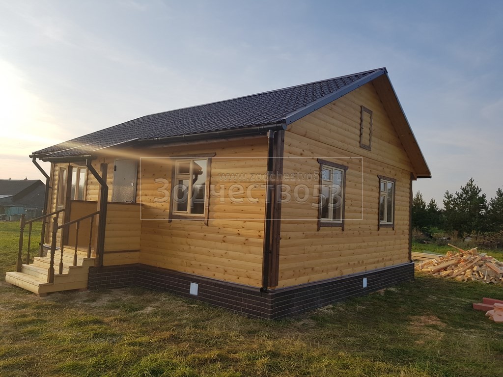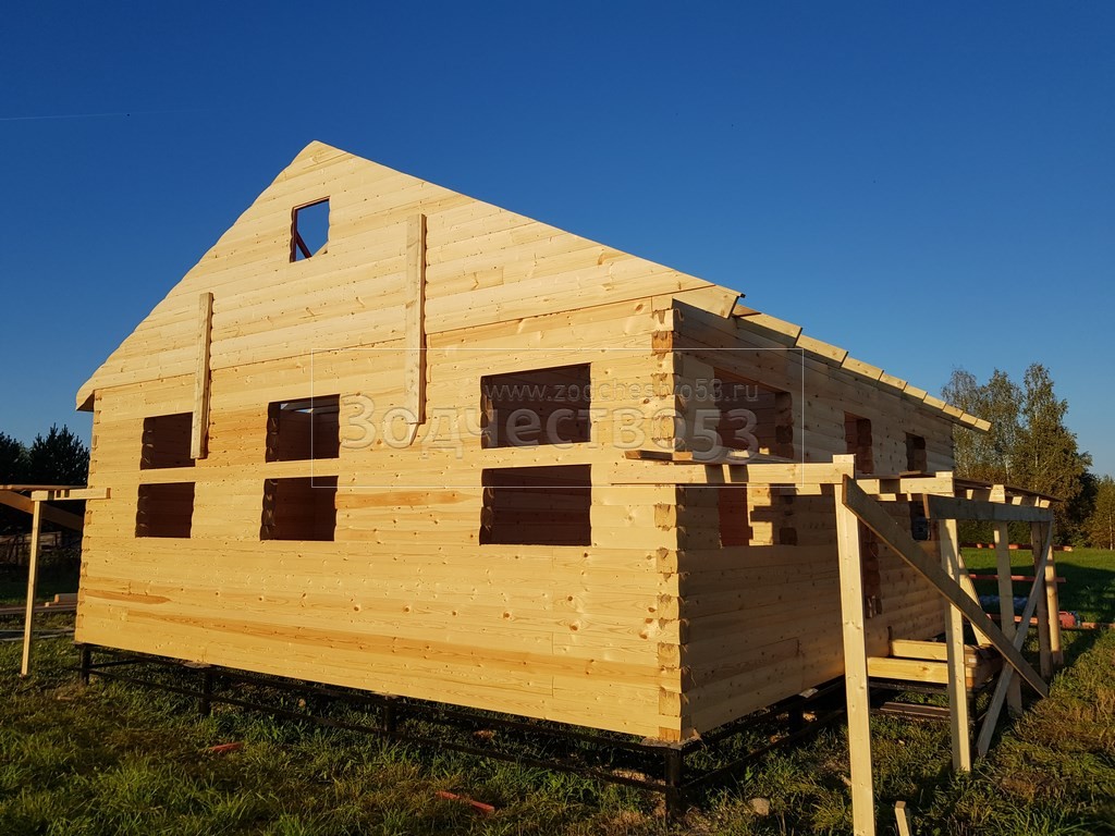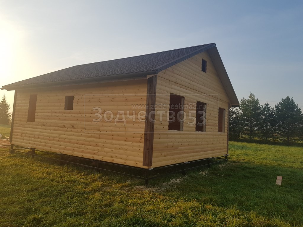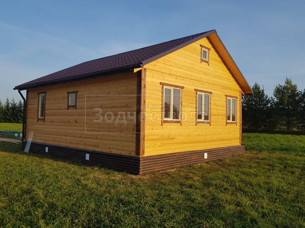 Одноэтажный дом общими размерами 7.0х8.0 из профилированного бруса 140х140 (камерной сушки) под двухскатной крышей и открытой террасой 1.50х1.0 м., под отдельной односкатной крышей. Объект построен: Московская обл., Можайский район, д. Шохово, д. 20б.