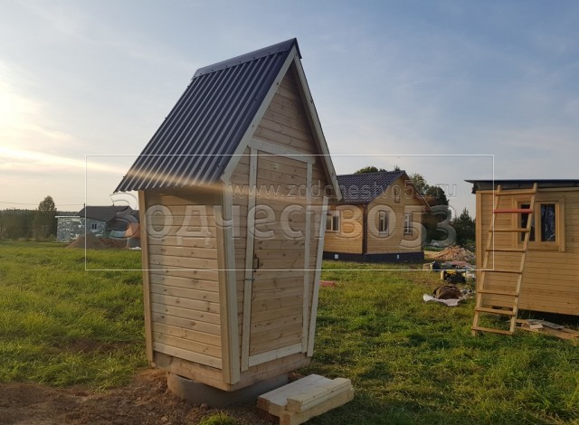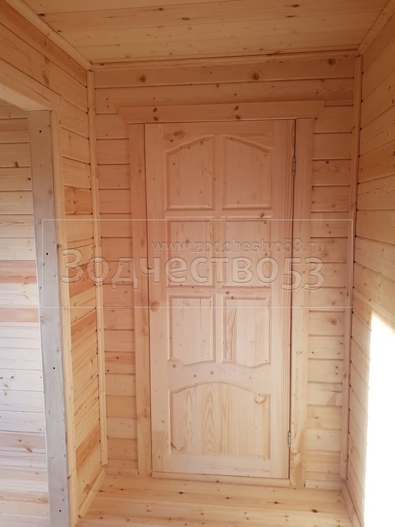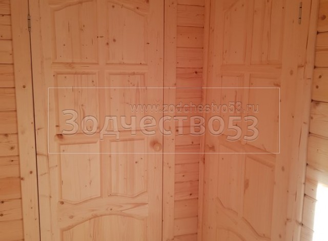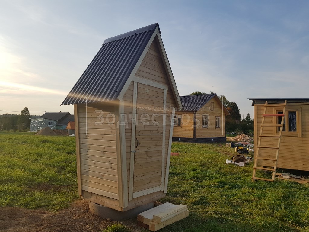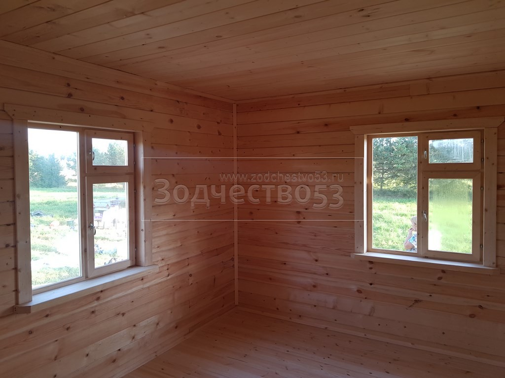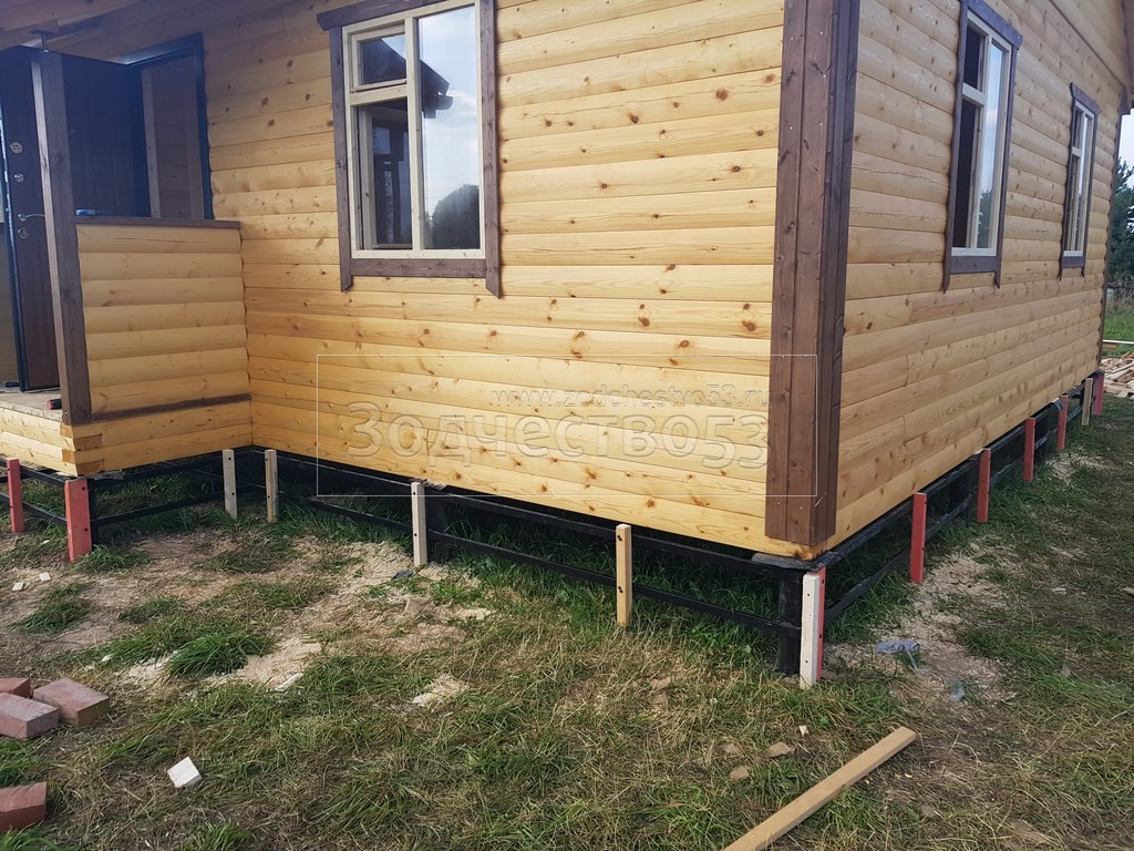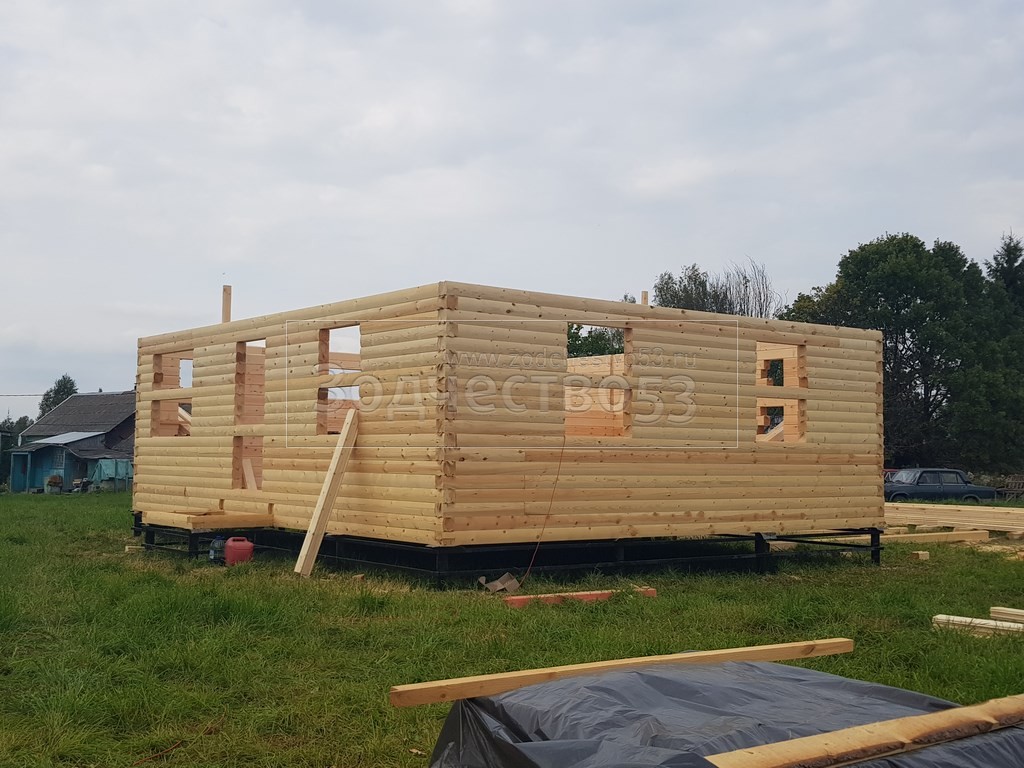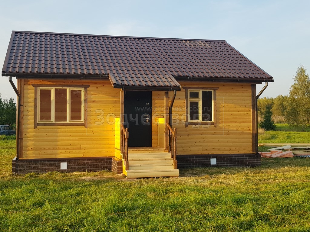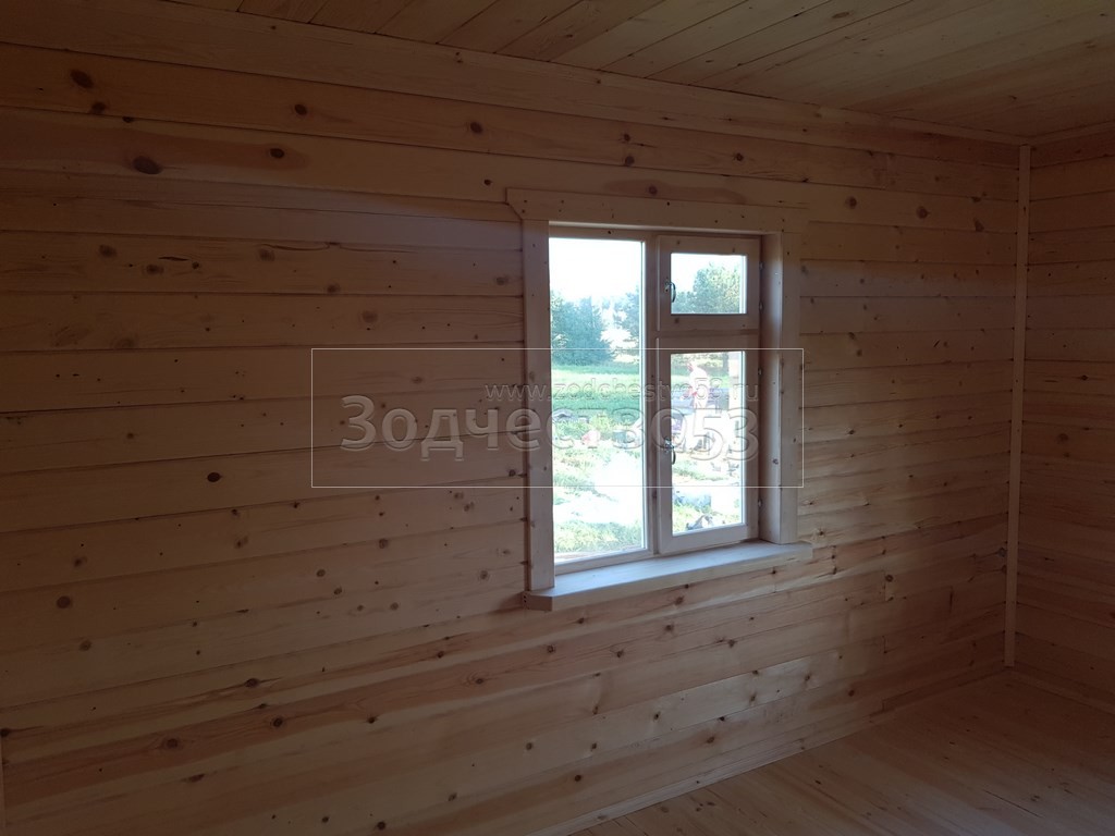 Одноэтажный дом общими размерами 7.0х8.0 из профилированного бруса 140х140 (камерной сушки) под двухскатной крышей и открытой террасой 1.50х1.0 м., под отдельной односкатной крышей. Объект построен: Московская обл., Можайский район, д. Шохово, д. 20б.