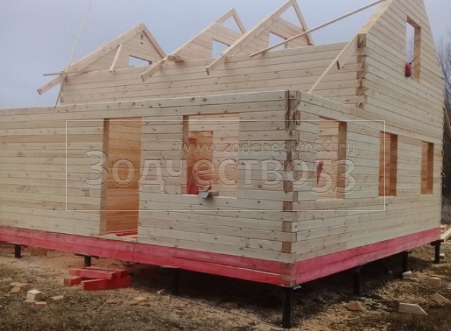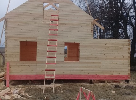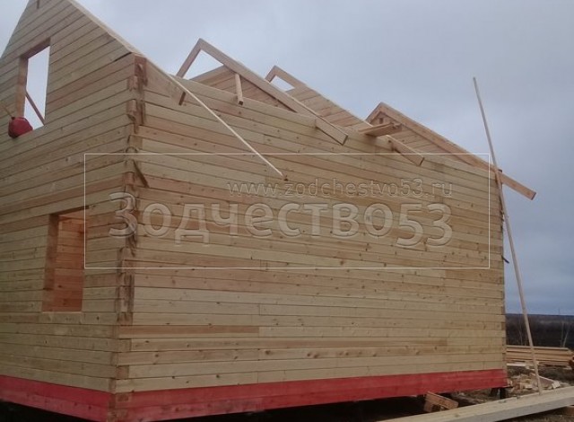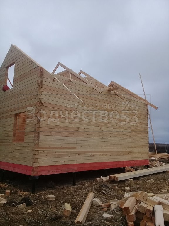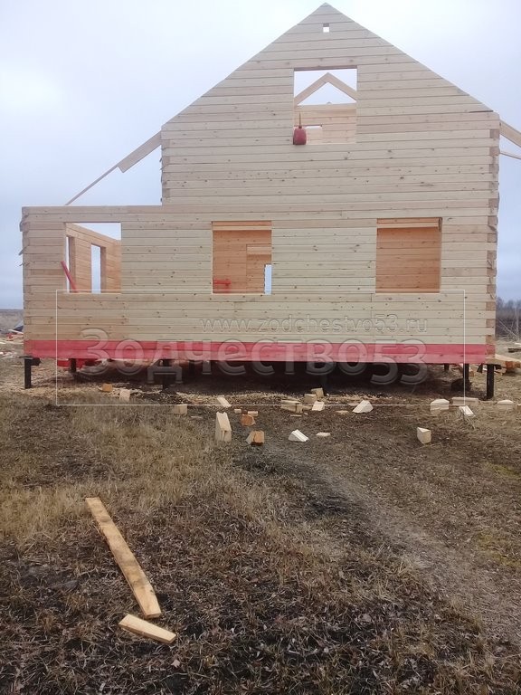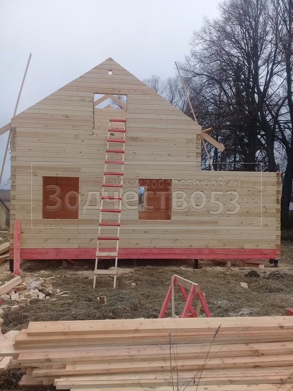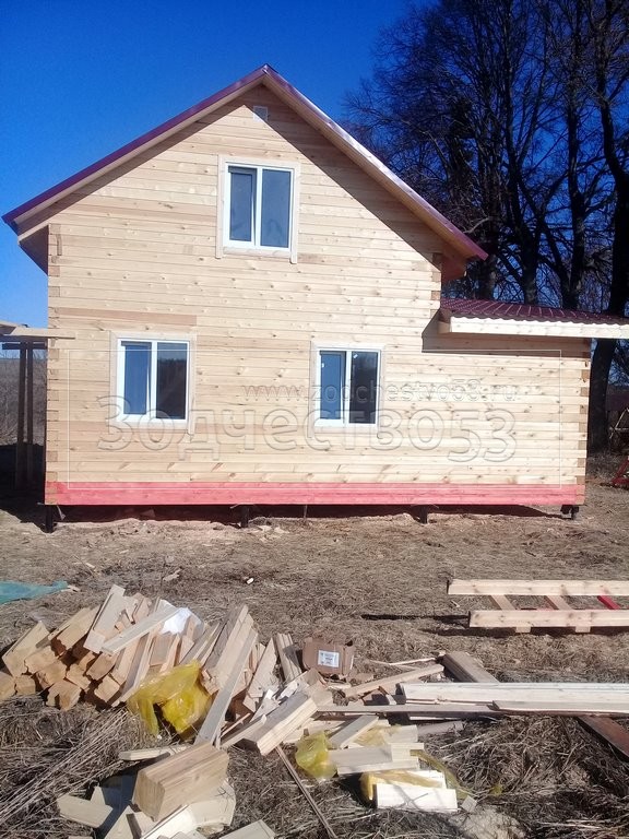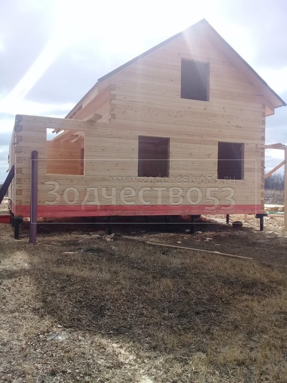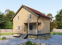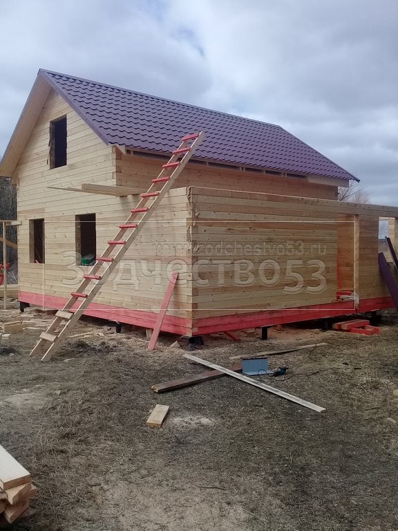 Дом 8.0*8.0 из профилированного бруса 150*150 (5.50*8.0 полутораэтажный дом с брусовыми фронтонами под двухскатной крышей и веранда ,одноэтажная,2.50*8.0 из профилированного бруса 150*150, под отдельной двухскатной крышей). Объект построен: Калужская область,р-он Мещовский, с. Новоселки, ул. Камышовая, д. 8А.