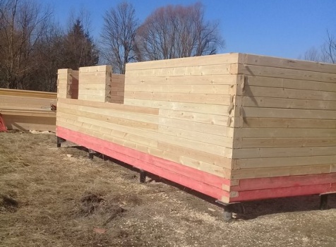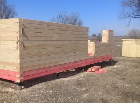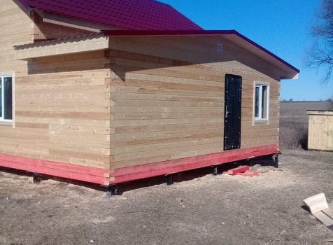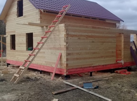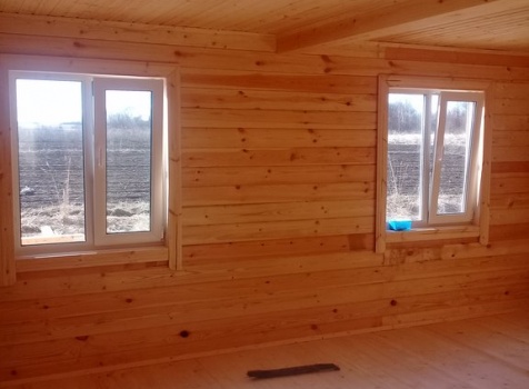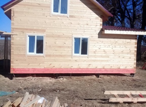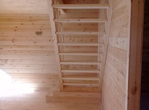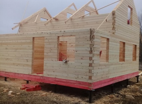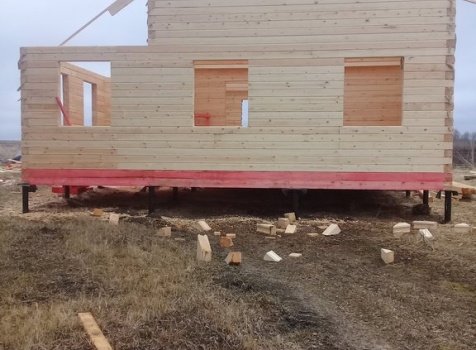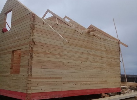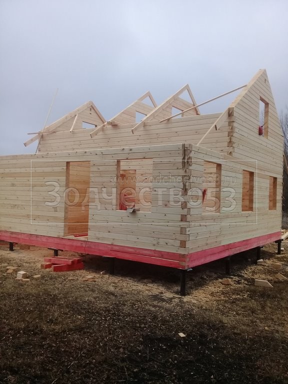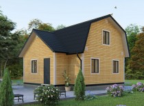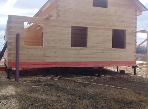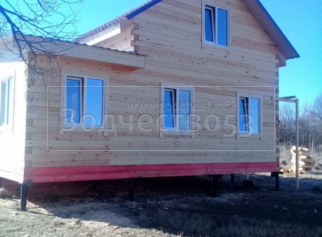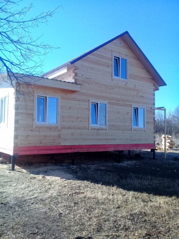 Дом 8.0*8.0 из профилированного бруса 150*150 (5.50*8.0 полутораэтажный дом с брусовыми фронтонами под двухскатной крышей и веранда ,одноэтажная,2.50*8.0 из профилированного бруса 150*150, под отдельной двухскатной крышей). Объект построен: Калужская область,р-он Мещовский, с. Новоселки, ул. Камышовая, д. 8А.