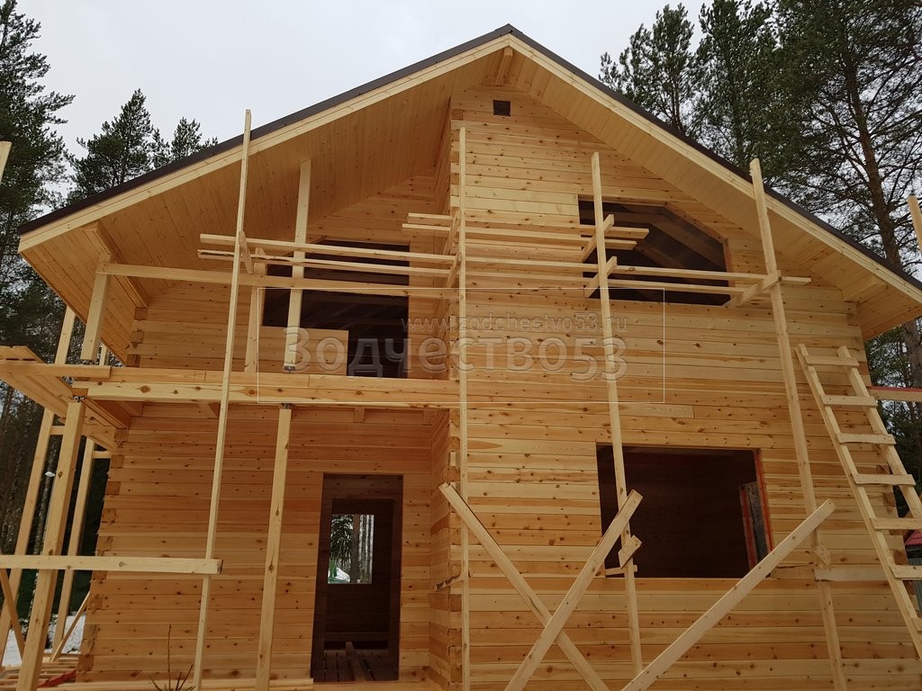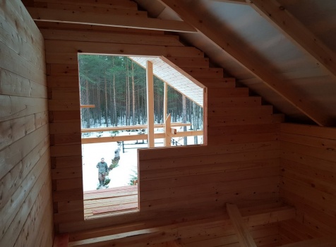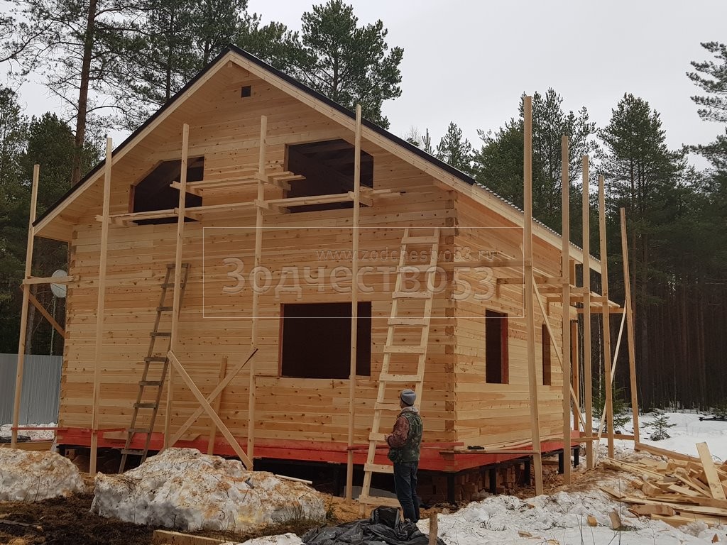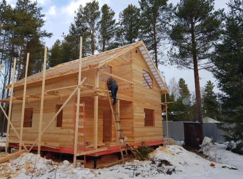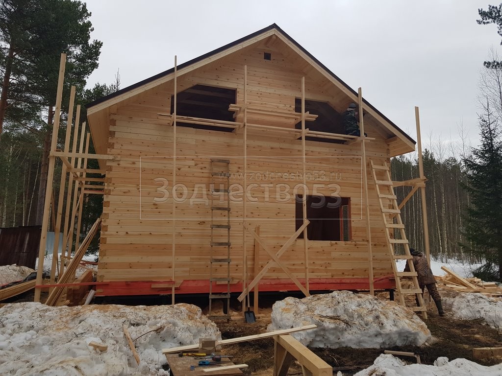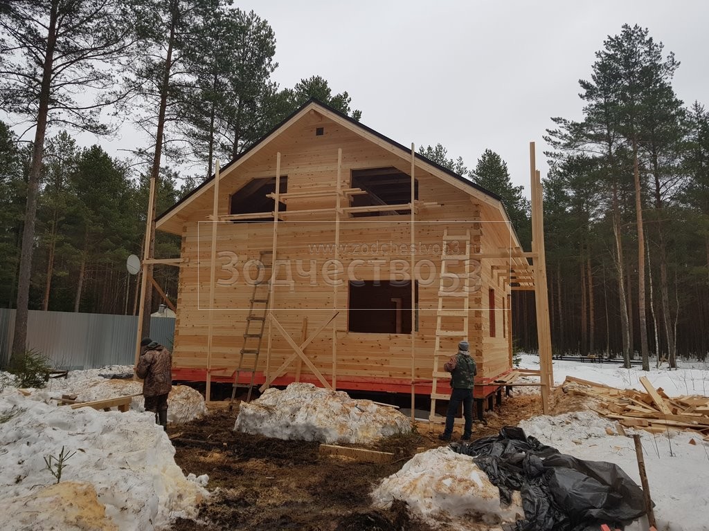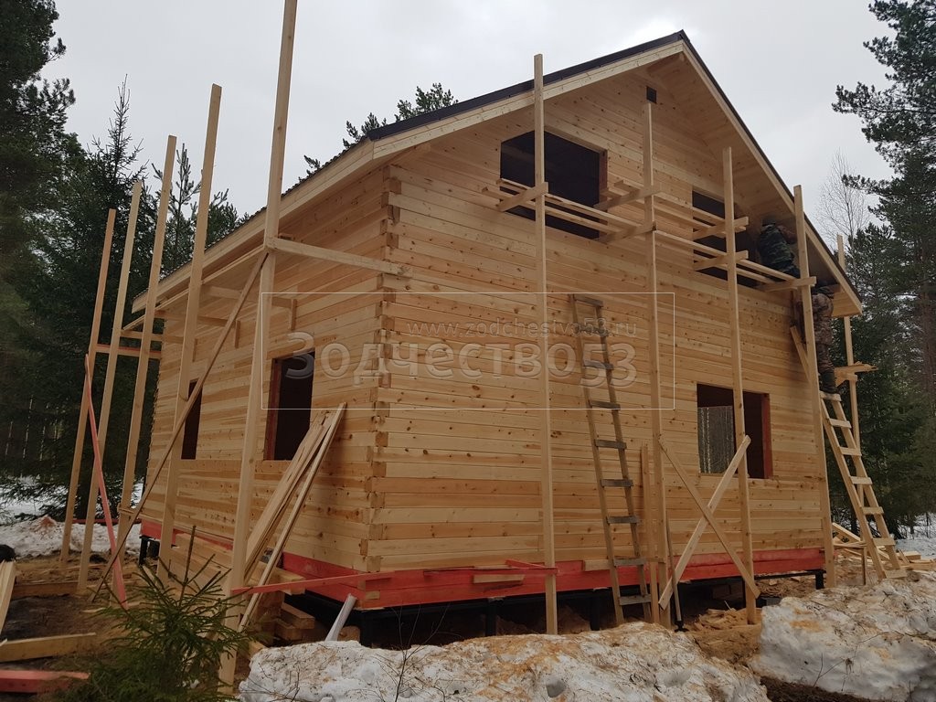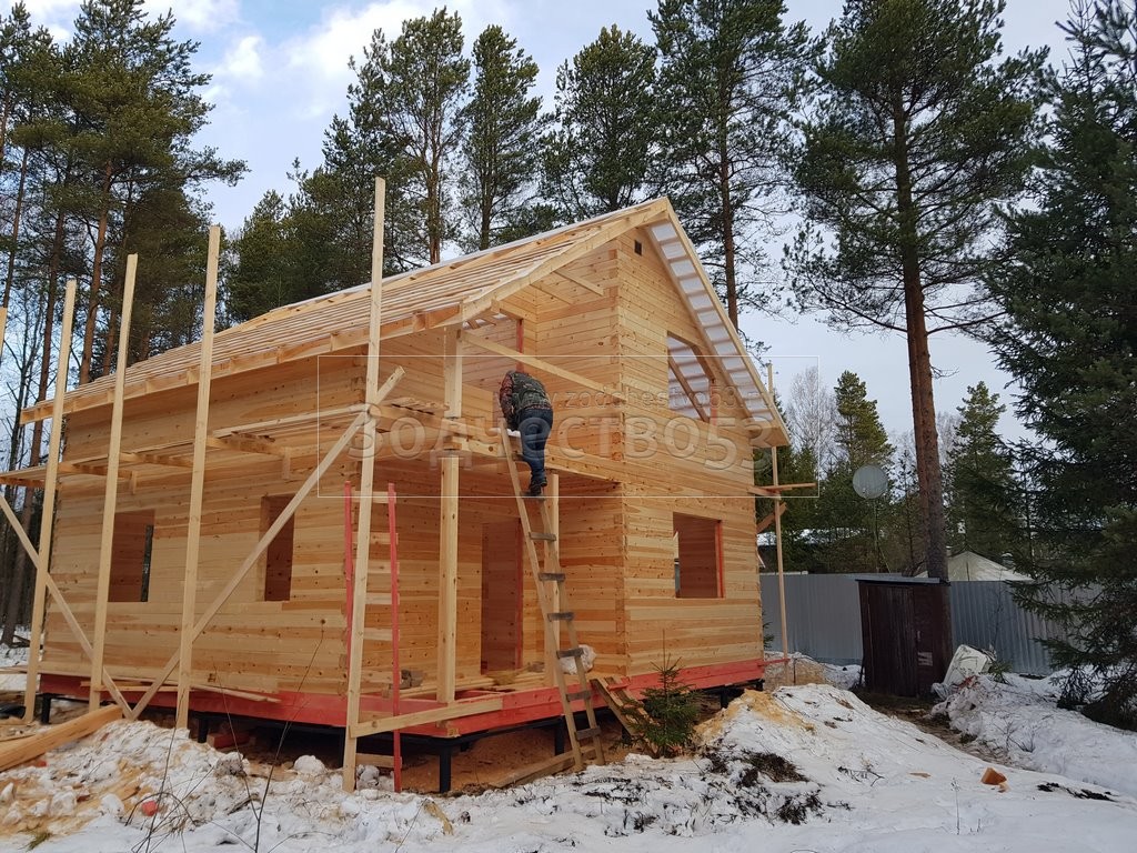Полутораэтажный дом 8.0*8.0 из профилированного бруса 150*150 с брусовыми фронтонами под двухскатной крышей.
