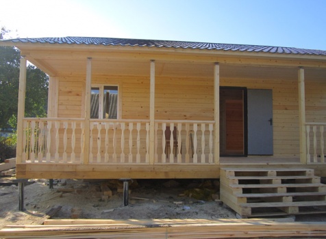 Одноэтажный дом 8×9 по проекту Д-57 из профилированного бруса 200×150 (Дом 6×9 и открытая терраса 2×9 с резными балясинами под общей двухскатной крышей). Построен в Тверской области, Калининском районе, Михайловском сельском поселении