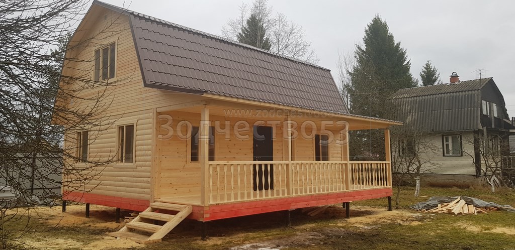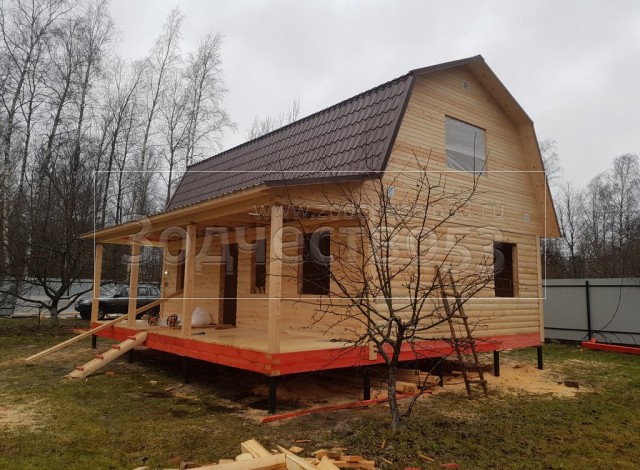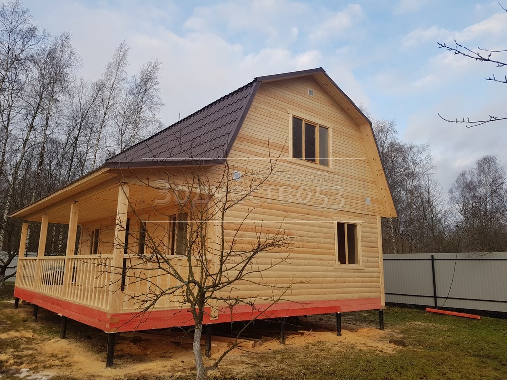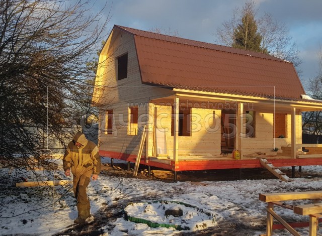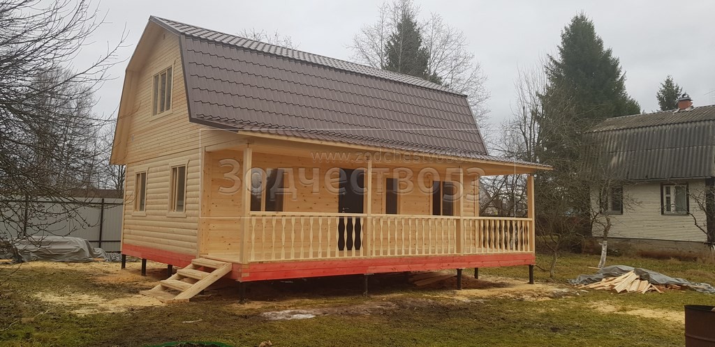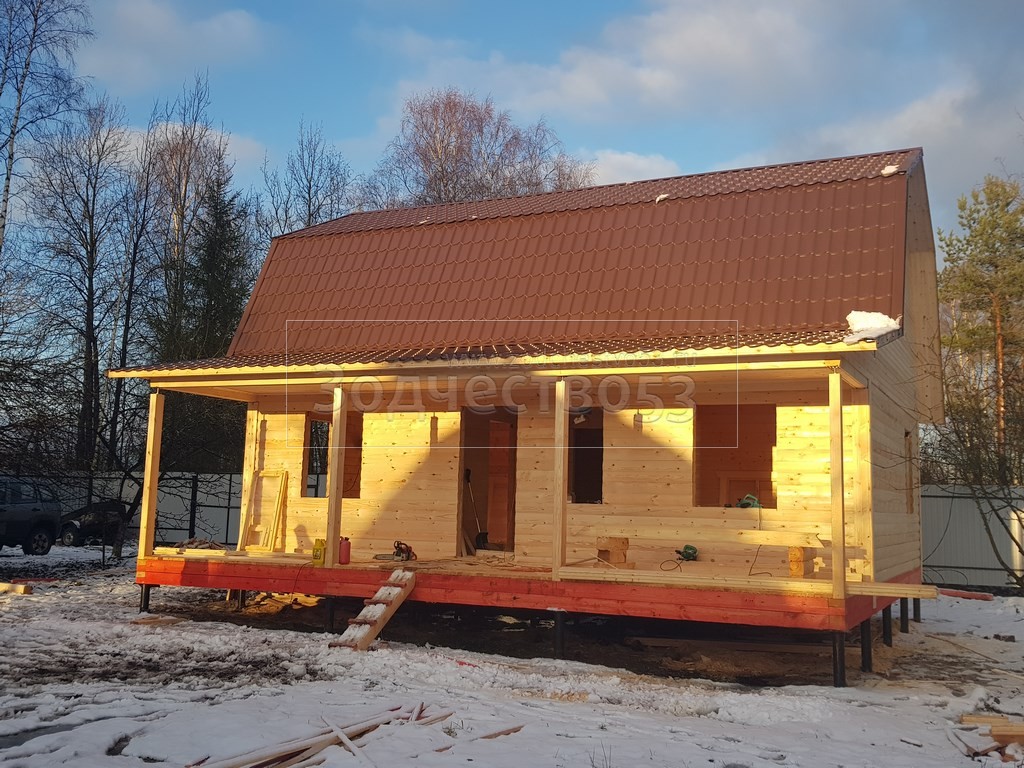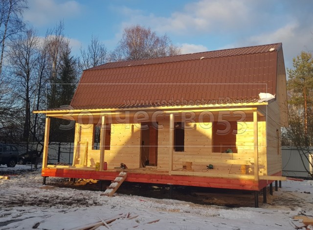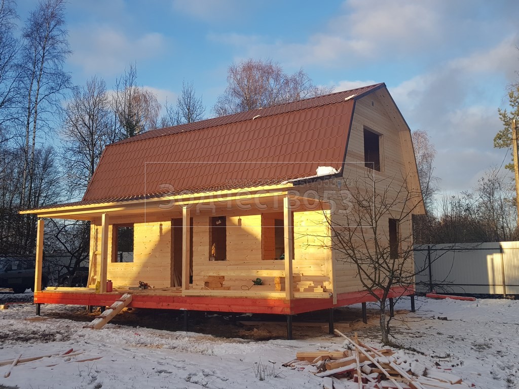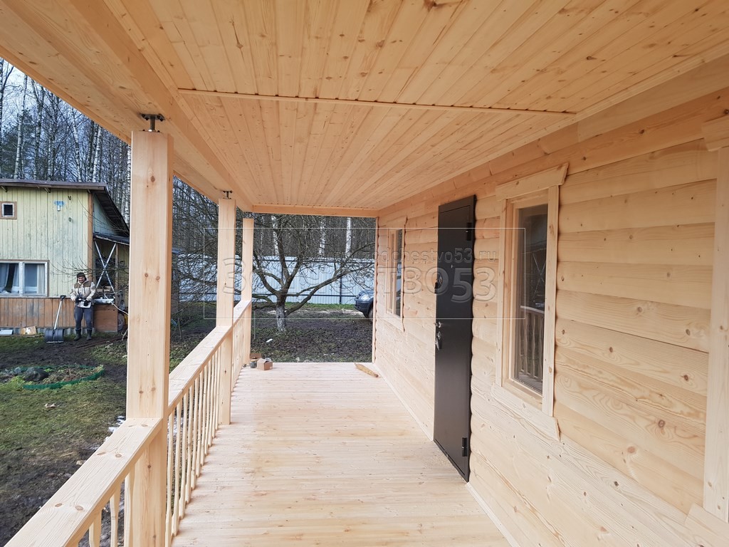 Дом общими размерами 8.0*9.0 (6.0*9.0 из профилированного бруса 140*140, под ломаной крышей и 2.0*9.0 открытая терраса под отдельной односкатной крышей). Построен: Ленинградская область, Кировский район, СНТ Восход 4, улица Детская 1.