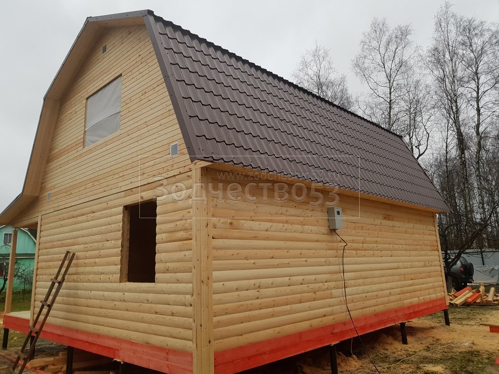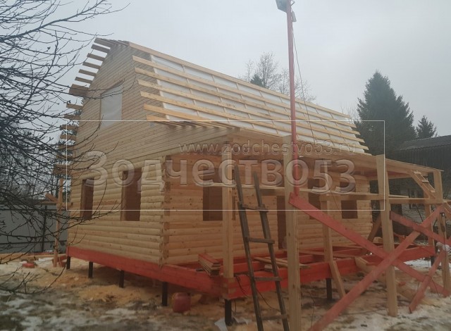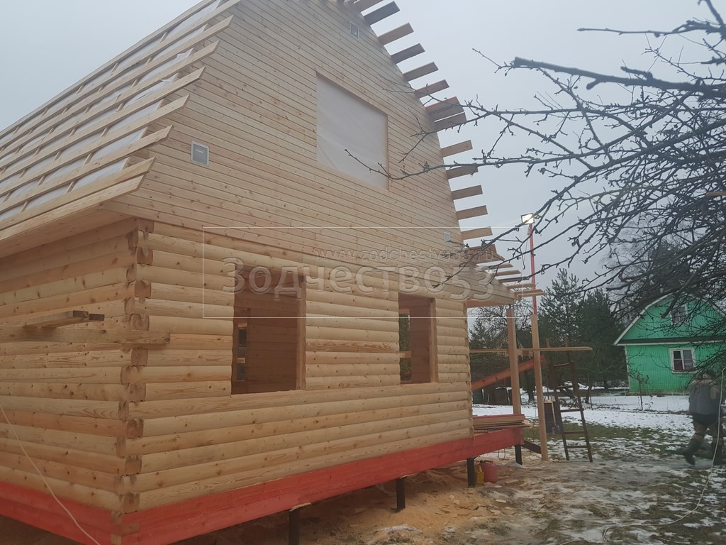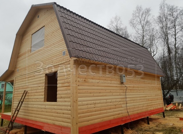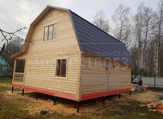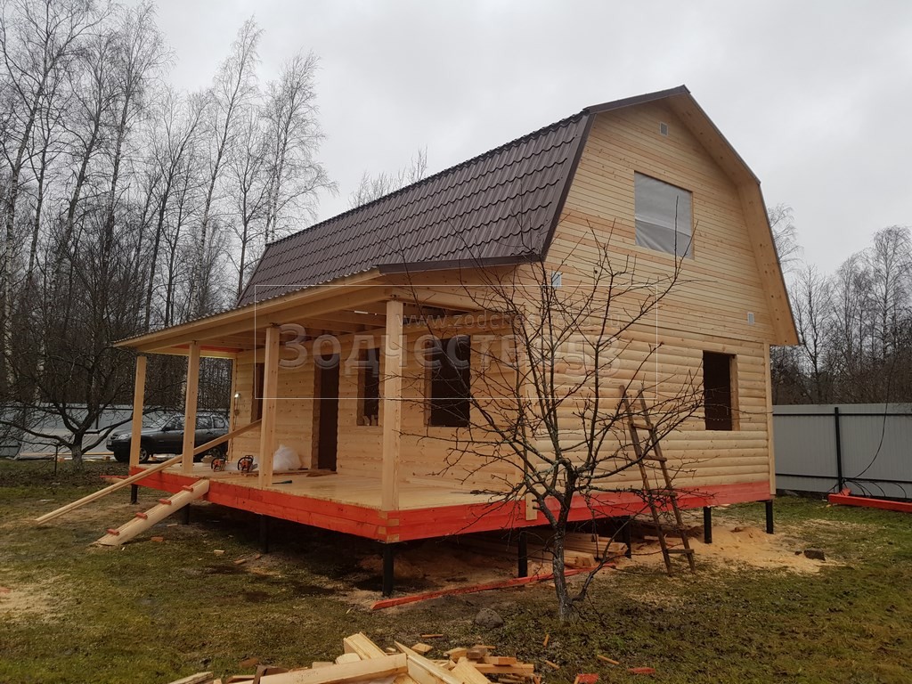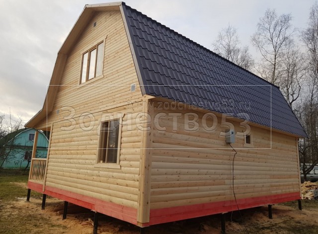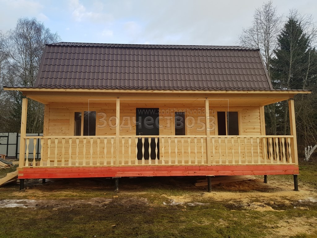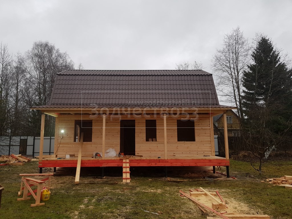 Дом общими размерами 8.0*9.0 (6.0*9.0 из профилированного бруса 140*140, под ломаной крышей и 2.0*9.0 открытая терраса под отдельной односкатной крышей). Построен: Ленинградская область, Кировский район, СНТ Восход 4, улица Детская 1.